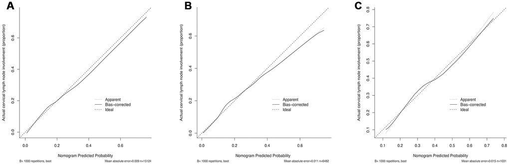 Few researches were reported on nomogram predicting CRLNI in patients with PTC, especially with PTMC [20–24]. Wang et al. performed a nomogram to predict the risk of level V lymph node involvement [20]. Similarly, Hei et al. performed another nomogram for predicting lateral neck lymph node involvement [25]. Although their purpose was not the same, there existed common deficiencies such as small sample size (1037 and 505 samples) and the absence of external validation. Both models were internally validated through a bootstrapping analysis, which may lead to over-fitting of the model. Moreover, in the study by Kim, their model was validated by both internal and external data sets, but the AUC value of the training set was only 0.721 [22]. Meanwhile, these researches focused on nomograms predicting CRLNI in patients with PTC rather than PTMC. In our study, we analyzed the data based on the SEER database to construct a preoperative model that was validated by internal and external data sets, including data from our medical center. In this model, the AUC value and C-index of the training set were both 0.766 and calibration curve suggested the actual probability of CRLNI corresponded closely with the predicted probability of CRLNI in PTMC patients, which indicated relatively good discrimination ability [26]. Furthermore, the AUC values and C-index were maintained at a good level in both internal and external validation sets.