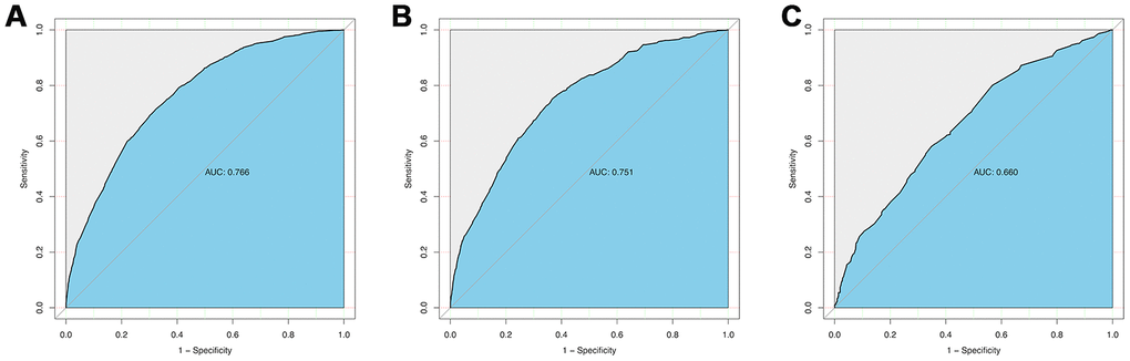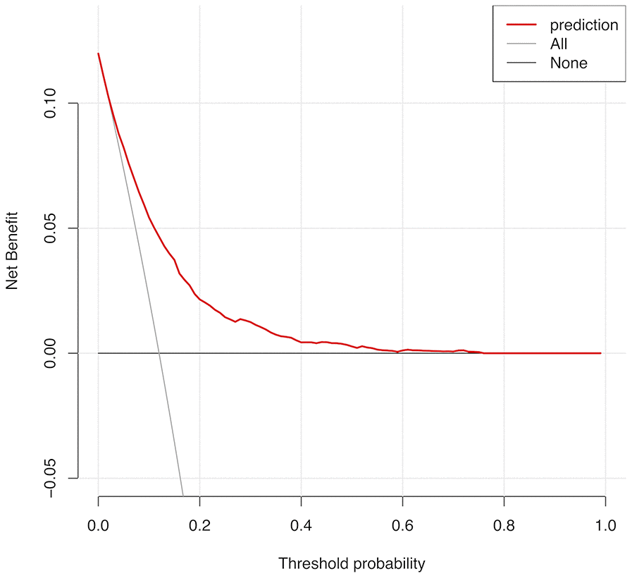The calibration curve of the cervical regional lymph node involvement risk nomogram in PTMC suggested great agreement in both training data set and testing data sets including internal and external testing sets, and all the Mean absolute error ≤ 0.015 (Figure 3). The C-index of this predictive model in the training set was 0.766 (95%CI: 0.755–0.777), and the internal and external testing sets through cross-validation were 0.753 and 0.668, respectively. AUC was 0.766 for the training set, and the internal and external testing sets were 0.751 and 0.660 (Figure 4), which suggested the good prediction capability of this model. We also performed a Decision Curve Analysis (DCA), which showed that predicting the cervical regional lymph node involvement risk applying this model would be better than having all patients or none patients treated by this model with a range of the threshold probability between >1% and <75% (Figure 5).