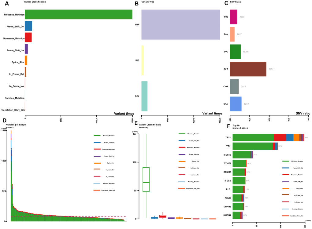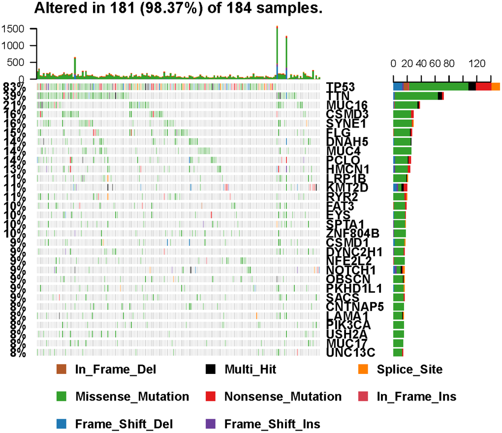 The summary of mutational genomic landscape was shown in Figure 1. By calculating the 9 variant classifications separately, missense mutation had the highest mutation frequency in the total mutation frequency (Figure 1A). In addition, single nucleotide polymorphism (SNP) was more common than INS and DEL (Figure 1B). Single nucleotide variants (SNVs) were classified into 6 base substitutions (C > A, C > G, C > T, T > A, T > C and T > G), and the results indicated C > T had the highest incidence (16511 times, Figure 1C). The values of variants varied from 0 to 1585, with a median value of 87 (Figure 1D). Missense mutation had the highest mutation frequency in personal mutation frequency (Figure 1E). We calculated the genes with the highest mutational rate, and the top 10 mutated genes were as follows: TP53, TTN, MUC16, SYNE1, CSMD3, MUC4, FLG, PCLO, DNAH5 and HMCN1 (Figure 1F). The waterfall map summarized the high mutated genes and their mutation classification (Figure 2). In addition, the proportion of more mutated genes was visualized using the genecloud (Supplementary Figure 1). Genes with mutation frequency ≥ 5 times were presented in the genecloud, which was consistent with the results in Figure 1F and Figure 2. These high mutated genes might be functionally related, therefore, we further studied their interaction. The co-occurrence and exclusive relationships between these mutant genes were shown in Supplementary Figure 2. The co-occurrence correlation between RYR2 and FLG was the most significant (P < 0.001).