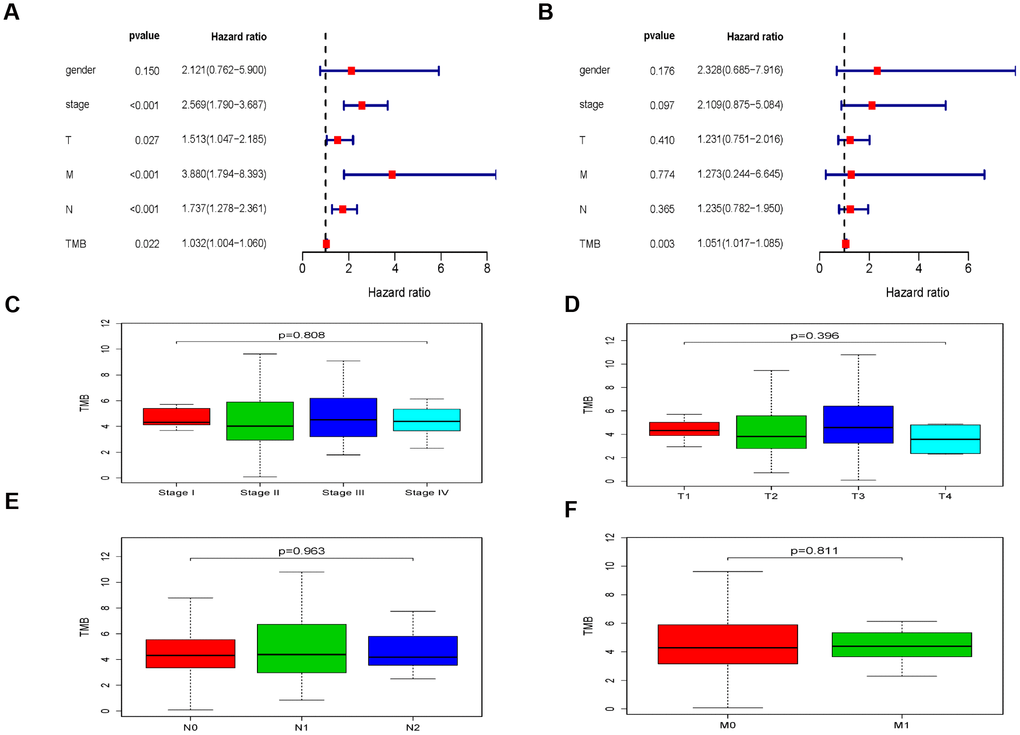 After integrating TMB and clinical information (genders, TNM stages, T stage, N stage and M stage), univariate and multivariate regression analysis on the impacts of prognosis were performed. The univariate regression analysis indicated that TMB, TNM stages, T stage, N stage and M stage were high-risk prognostic factors (hazard ratio > 1 and P < 0.05, Figure 3A). Multivariate regression analysis suggested TMB as the independent prognostic factor (hazard ratio = 1.051, P = 0.003, Figure 3B). Then, we further studied the relationship between TMB and TNM stages, and found that there was no significant correlation between TMB and TNM stages (TNM stage: P = 0.808, Figure 3C; T stage: P = 0.396, Figure 3D; N stage: P = 0.963, Figure 3E and M stage: P = 0.811, Figure 3F).