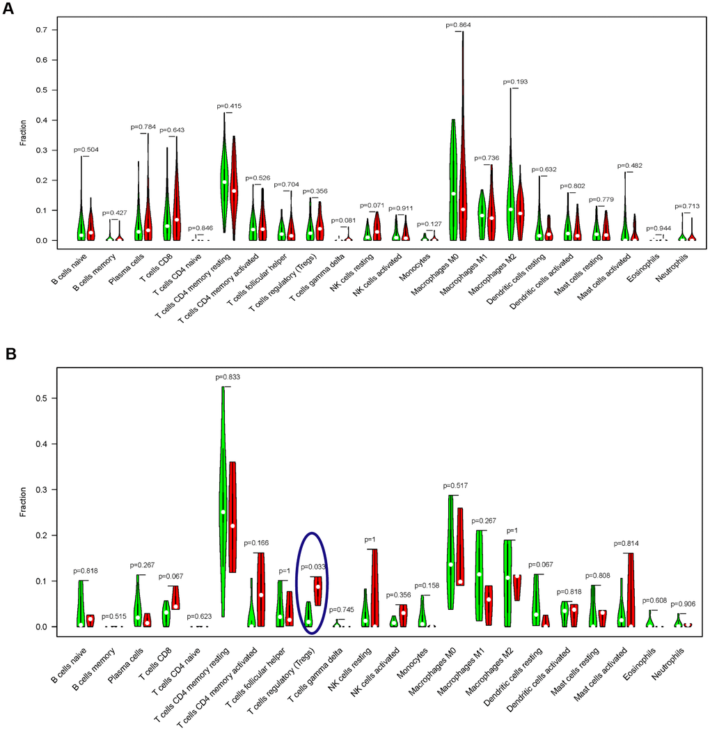 Prior to the immune infiltration, differences of gene expression between the TMB-H and TMB-L groups were calculated and visualized by “limma” package (Radiotherapy: Figure 4D and 4E; without Radiotherapy: Figure 4F and 4G). Based on this differentially expressed data, we used the deconvolution method to calculate the difference of immune cell infiltration between the TMB-H and TMB-L groups. The TMB-H group had significantly increased Tregs cell infiltration in EC patients who did not receive radiotherapy (P = 0.033), while there was no significantly different infiltration of 22 kinds of immune cells among patients receiving radiotherapy (Figure 5).