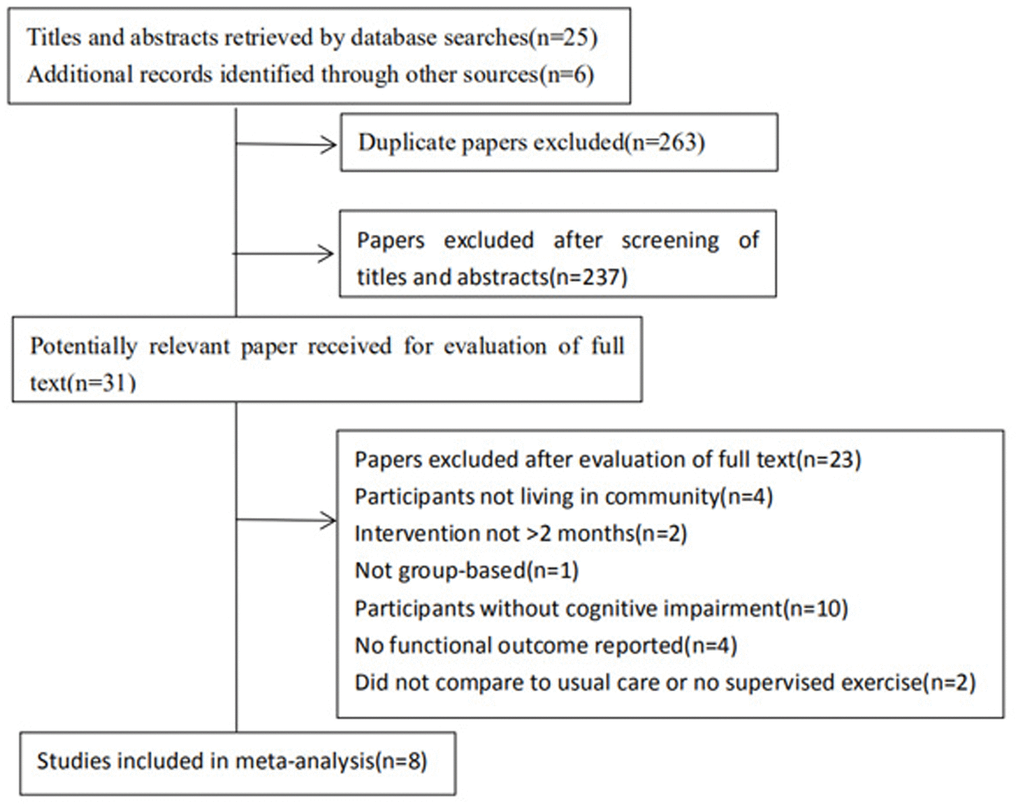 Initial database searching and reference list scanning identified 531 studies, with 268 remaining after the removal of duplicates (Figure 1). Inclusion and exclusion criteria were applied to the full texts, finally, seven randomized controlled trials and one prospective cohort study were included in this meta-analysis (Table 1) [16–23]. There were 636 participants included of this meta, the mean age of participants ranged from 68 to 81 years. The mean baseline Mini-Mental State Examination score among participants ranged from 12.4 to 26.7 (only one trail used MoCA score at 21.8). The intervention duration was around two months in two trials, six months in four trials and twelve months in two trials. All 8 trials included multicomponent exercise as the intervention. The content of the exercise programs was multicomponent (with a combination of stretching, strengthening, aerobic, balance, Tai chi and mental or cognitive exercises. In one trial, participants performed a biking program with visual reality). Considering the intensity of aerobic exercise, moderate to vigorous intensity was used in most of the studies analyzed. Control of the intensity of intervention programs were based on maximum heart rate around75%. The frequency of exercise of included studies varied from one to four sessions a week. Exercise sessions were between 0.5 and 4 hours long and included warm ups and cool downs. The programs were supervised by physiotherapists with experience in geriatric rehabilitation or dementia, or by trained carers, coaches or stuff members. Comparators included: normal care [16–18], education or interest classes [19–23], and only one was video game [23]. There was a limited variety of biomarkers assessed within studies. Considering neurotrophic factors, BDNF (brain-derived neurotrophic factor) was the outcome of three of eight selected studies [17, 22, 23]. Drop-out rates of participants receiving an exercise intervention were reported in all trials and ranged from 6% to 33%, with a combined drop-out rate of 12%. Participant adherence rates ranging between 75% and 99%.