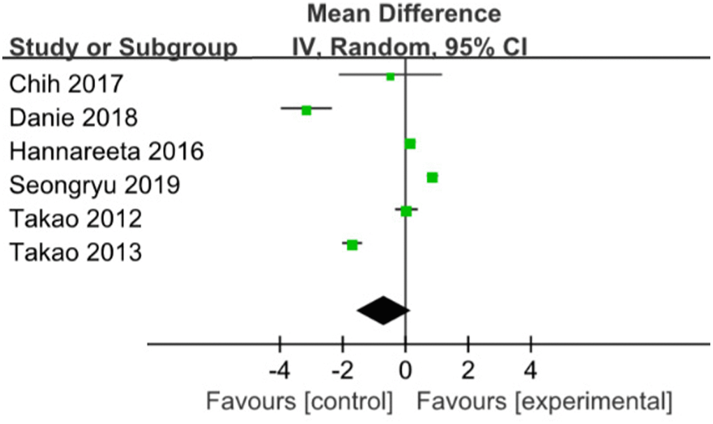 Six trials with 546 patients investigated the effects of multicomponent intervention on global cognitive function using MMSE (Mini-Mental State Examination) scores. Global cognitive function was no significantly improved in the intervention groups (WMD= -0.68; 95%CI: -1.58 to 0.22), with high heterogeneity existed (P<0.01, I2= 98%) [16, 18–22] (Figure 2). However, three studies with multicomponent training duration of 12 months [16, 18, 19] were included for subgroup analysis (WMD:0.18; 95%CI: 0.02 to 0.34; p:0.03), with heterogeneity of 0% (p= 0.65), this result is in favour of the positive effect of multicomponent intervention on global cognitive function.