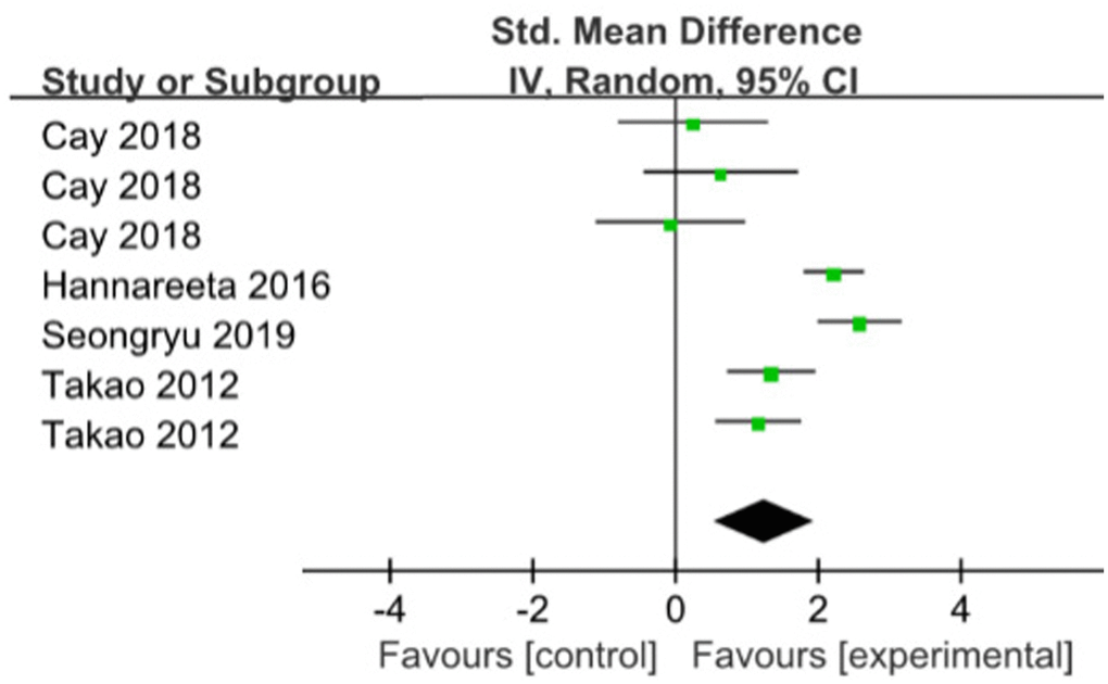 Executive Function Pooled analysis of four RCT indicated that those with ME had better executive function compared with those without (SMD=1.25; 95%CI: 0.57 to 1.93; I2=85%) [16, 19, 20, 23]. (Figure 5). When the trial with the big sample size was removed in a sensitivity analysis [19], compared with the control group, meta-analysis showed that ME had significance for improving executive function (SMD=0.80; 95%CI:0.28 to 1.31), with heterogeneity of 48% (p=0.10).