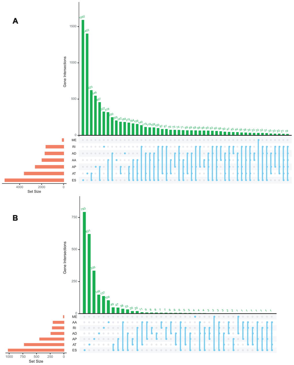 A total of 92 ACC patients from TCGA database were included in the present study. The clinicopathological characteristics of these 92 cases were summarized in Table 1. The AS events were comprehensively analyzed. Intersections among these seven types of AS events and quantitative analysis of these interactive sets were presented by the UpSet plot (Figure 1A). These data suggested that a single gene could possess several types of mRNA splicing events and ES was the predominant type in ACC cohort whereas ME was rare.