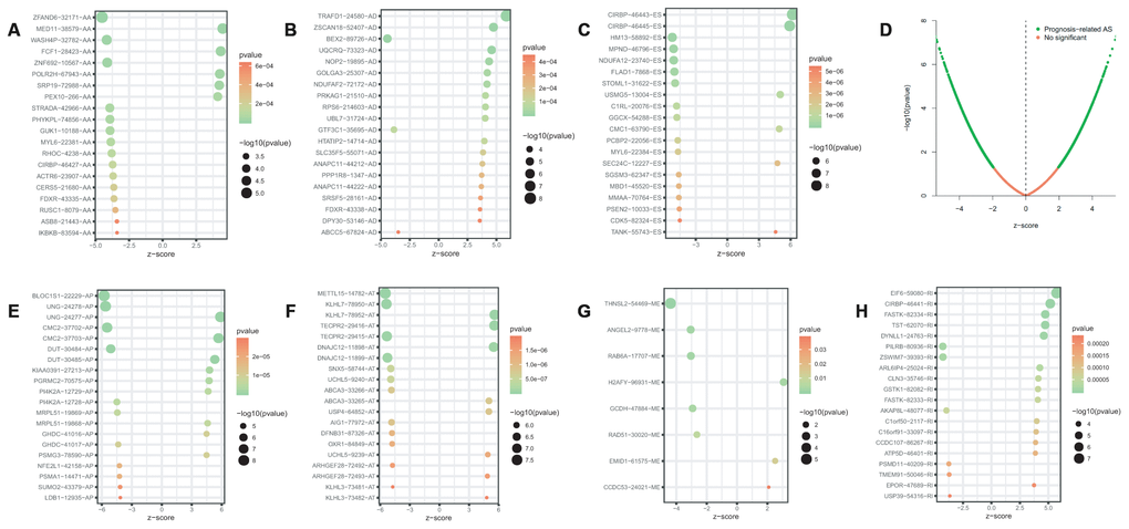 Univariate Cox regression analysis between AS events and OS was conducted to determine the survival associated-AS events. A total of 3919 AS events were significantly associated with OS (P<0.05). Consequently, one gene might contain two or more AS events that were remarkably related to the OS, and ES was the most common survival associated event. The UpSet plot was generated to visualize the intersecting sets of genes and splicing types vividly (Figure 1B). The top 20 (if available) significant survival associated AS events of each type were selected and visualized in Figure 2. The distributions of AS events significantly associated with OS were displayed in Figure 2D.