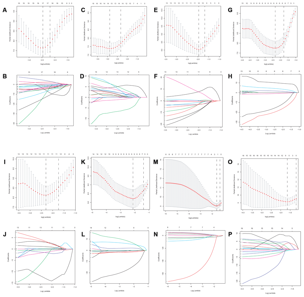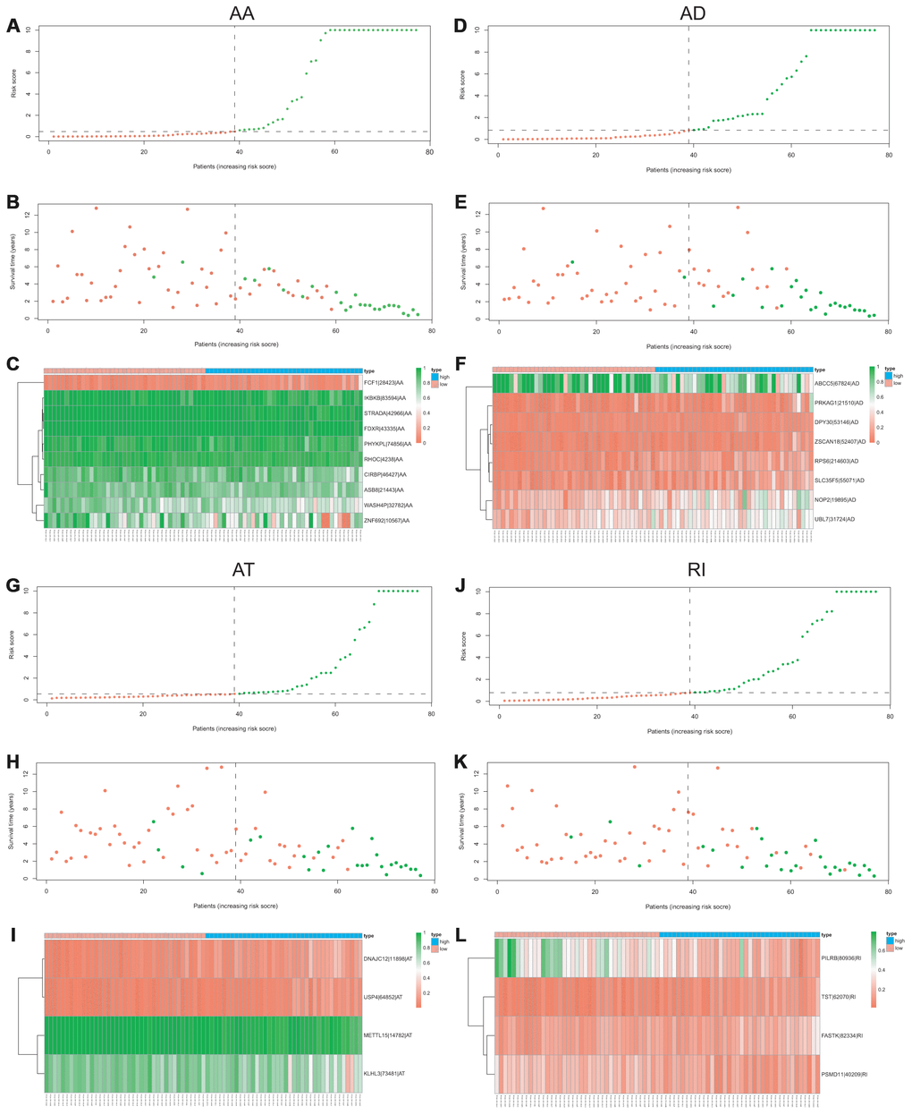 Lasso regression analysis was further conducted to screen highly correlated AS events and avoid overfit the models constructed subsequently. Multivariate Cox regression analysis was applied to calculate the prognostic risk scores for OS prediction based on seven types of AS events. All patients were divided into high-risk group and low-risk group according to the median risk score. Kaplan–Meier curves were used to demonstrate the survival probability variation between low-risk and high-risk subgroups. Receiver operating characteristic (ROC) curve was constructed and the area under the curve (AUC) was also calculated. Further, prognostic evaluation of the risk score was performed using risk curve. The expression heatmap, distribution of risk score and survival time of related signature were then visualized.