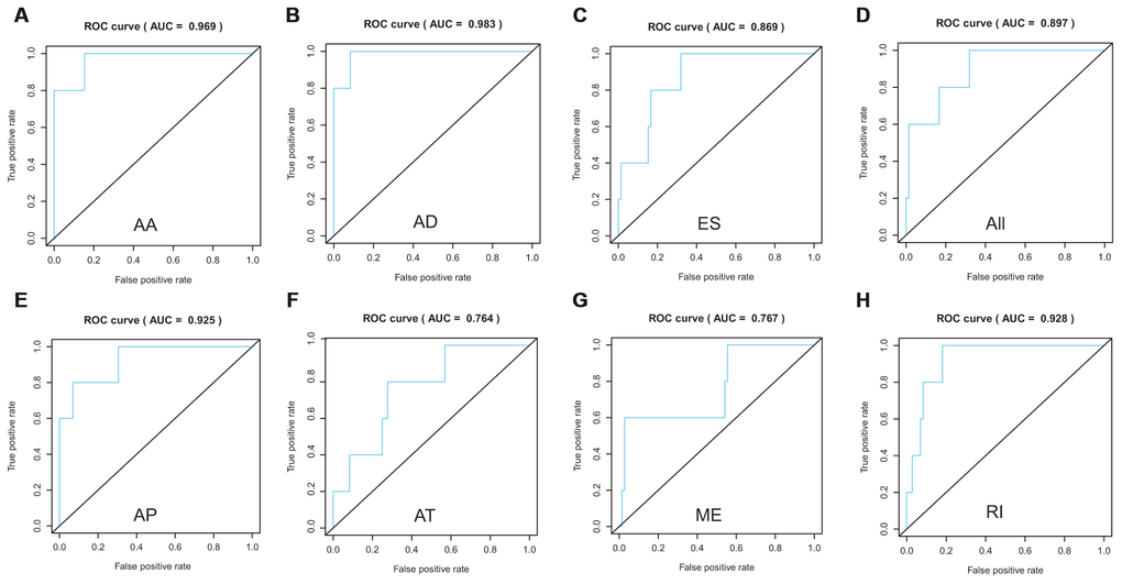 Lasso method followed by multivariate Cox regression analyses were performed to evaluate the prognostic capacity of these survival related AS events. The results of Lasso regression analysis including seven types of AS events and all AS events were presented in Figure 3. Using Lasso regression analysis, we selected the most highly correlated AS events. Next, the particular AS events were selected and risk scores were calculated based on multivariate Cox regression model. The detailed information of particular AS events in the eight prognostic models was shown in Table 2. Moreover, ACC patients were stratified into low-risk and high-risk groups based on the median value of the risk score as cut off. The Kaplan-Meier curves were employed to demonstrate the survival probability variation of patients in the low-risk and high-risk groups. The results showed that survival time differed notably between these two groups in each type and the whole cohort (Figure 4). The ROC curves were generated to evaluate the predictive power of each prognostic signature. Finally, four prognostic signatures with AUC ≥ 0.9 were selected for subsequent analysis. The results revealed that risk score of AD performed the greatest prognostic power with an AUC of 0.983, followed by risk score of AA with an AUC of 0.969 and risk score of RI with an AUC of 0.928 (Figure 5). The detailed information of corresponding splicing pattern of the candidate AS events, living status as well as survival time ranked by the distribution of risk score was displayed (Figure 6).