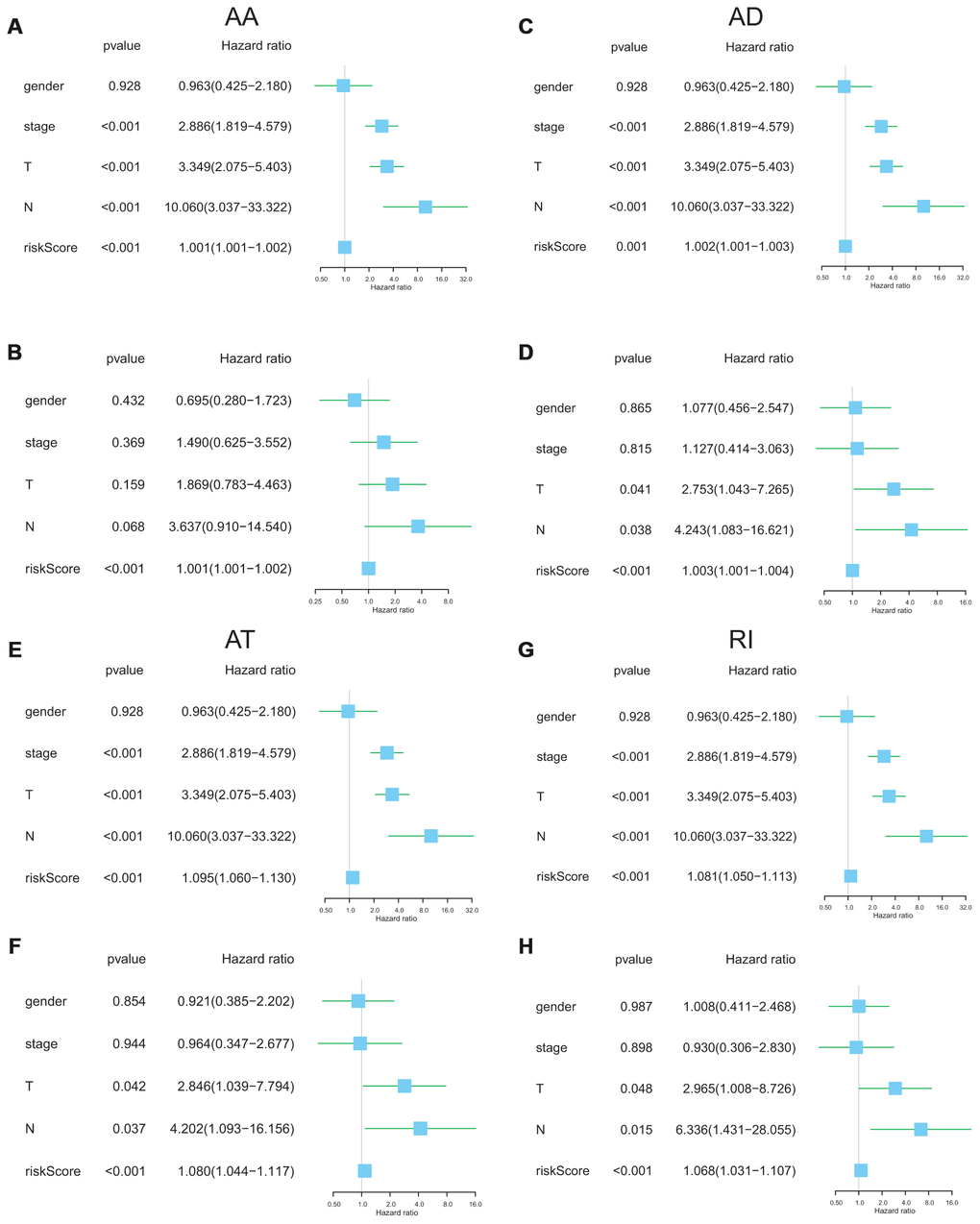 The following clinicopathological characteristic from TCGA database including gender, T stage, N stage and clinical stage were subjected to subsequent analysis. Univariate and multivariate Cox regression analysis was performed to evaluate whether the final AS prognostic signature with an AUC ≥ 0.9 was an independent risk factor of OS.