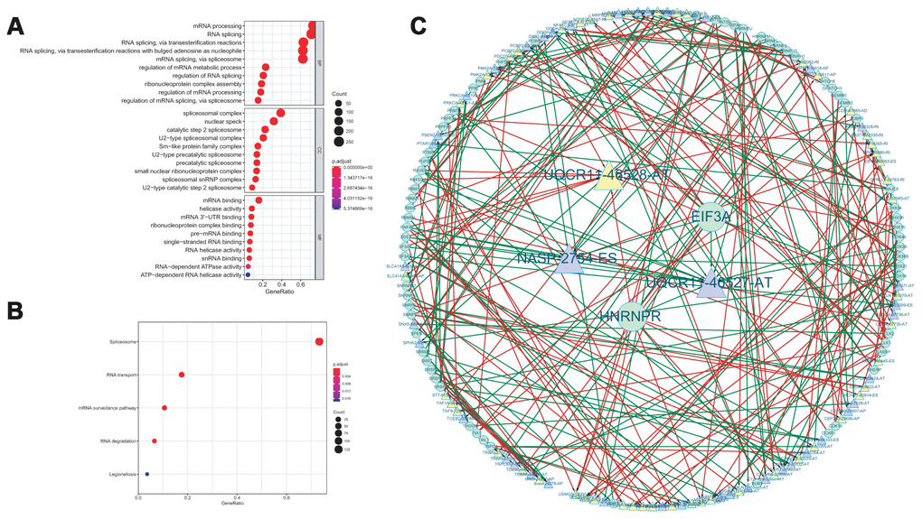 Then, a correlation network between the expression of SFs and the PSI values of survival-associated AS events was conducted. As shown in Figure 8C, there were a total of 42 down-regulated AS events (purple triangles), 50 up-regulated AS events (yellow triangles) and 67 SFs in this network. In this network, we selected the five most significant nodes as the hub AS events or hub SFs according to the degree, including one upregulated AS event (UQCR11-46528-AT), two downregulated AS events (UQCR11-46527-AT and NASP-2754-ES) and two SF (EIF3A and HNRNPR).