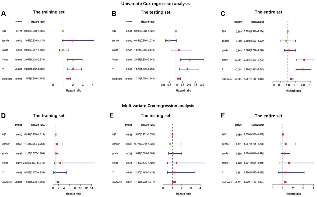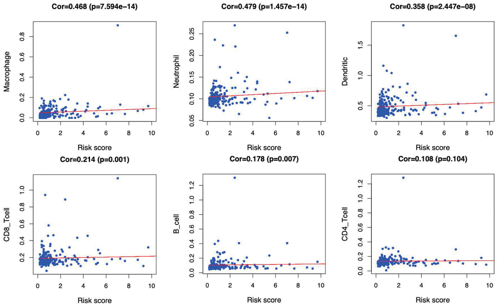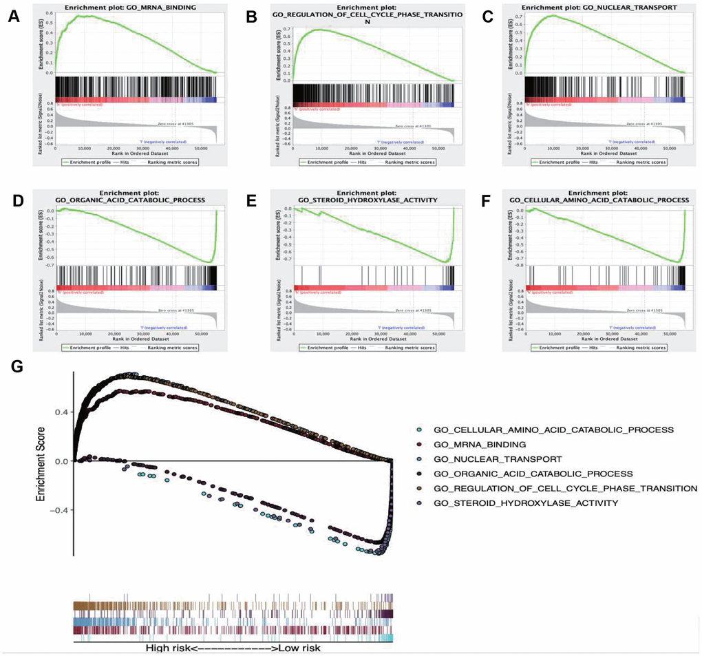 GSEA was performed to further investigate the differences between the high- and low-risk groups. The results revealed that the GO molecular function “mRNA binding” (Figure 9A), biological process “Regulation of cell cycle phase transition” (Figure 9B) and “Nuclear transport” (Figure 9C) were differentially enriched in high-risk phenotype (P< 0.01), while biological process “Organic acid catabolic process” (Figure 9D), molecular function “Steroid hydroxylase activity” (Figure 9E) and biological process “Cellular amino acid catabolic process” (Figure 9F) were closely correlated with the low risk phenotype (P< 0.01). In addition, KEGG pathway analysis suggested that the genes in high-risk group were mainly enriched in the “Spliceosome” (Supplementary Figure 2A), “RNA degradation” (Supplementary Figure 2B) and “Oocyte meiosis” (Supplementary Figure 2C) (P< 0.01); in addition, the “Complement and coagulation cascades” (Supplementary Figure 2D), “Glycine serine and threonine metabolism” (Supplementary Figure 2E) and “Primary bile acid biosynthesis” (Supplementary Figure 2F) were primarily enriched in low risk group (P< 0.01). Moreover, the immune status between the low- and high- risk group was also examined via GSEA, and the results suggested that the differentially expressed genes between these two groups were enriched in the immunological signature gene sets (c7. All. V7.0. symbol). According to the normalized enrichment score (NES), the top six immune related gene sets are shown in Table 2. Furthermore, the relationship of the prognostic signature with immune cell infiltration in TCGA-LIHC patients was investigated to examine whether the risk score partially reflected the tumor immune microenvironment status (Figure 10). Our results suggested that, for high risk patients in the entire set, the levels of macrophages (Cor=0.468; p=7.594e−14), neutrophils (Cor=0.479; p=1.475e-14) and DCs (Cor=0.358; p=2.447e−08), significantly increased in tumor microenvironment (TME) (Figure 10A–10C). Besides, CD8+ T cells (Cor=0.214; p=0.001) (Figure 10D) and B cells (Cor=0.178; p=0.007) (Figure 10E) were also showed association with high-risk group.