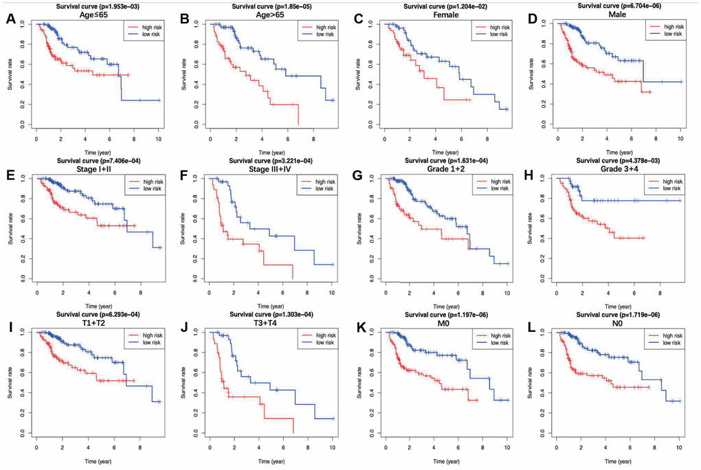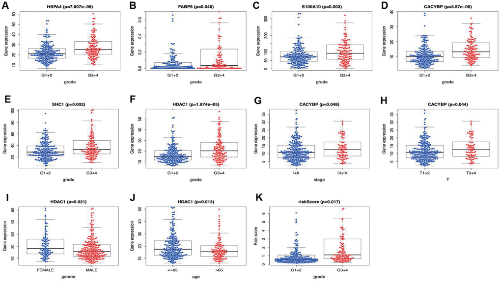 Two hundred and twenty-one patients with complete information including gender, age, tumor grade, clinical stage, T stage, lymph node metastasis and distant metastasis were included in TCGA-LIHC cohort. Among the signature genes we researched, HSPA4, FABP6, S100A10, CACYBP, SHC1 and HDAC1 were associated with a higher tumor grade (Figure 8A–8F), CACYBP was linked with a higher clinical stage as well as T stage (Figure 8G and 8H). Additionally, the expression level of HDAC1 was significantly enhanced in female patients and patients younger than 65 years old (Figure 8I and 8J). Afterwards, risk score derived from our model was significantly associated with higher tumor grade (Figure 8K).