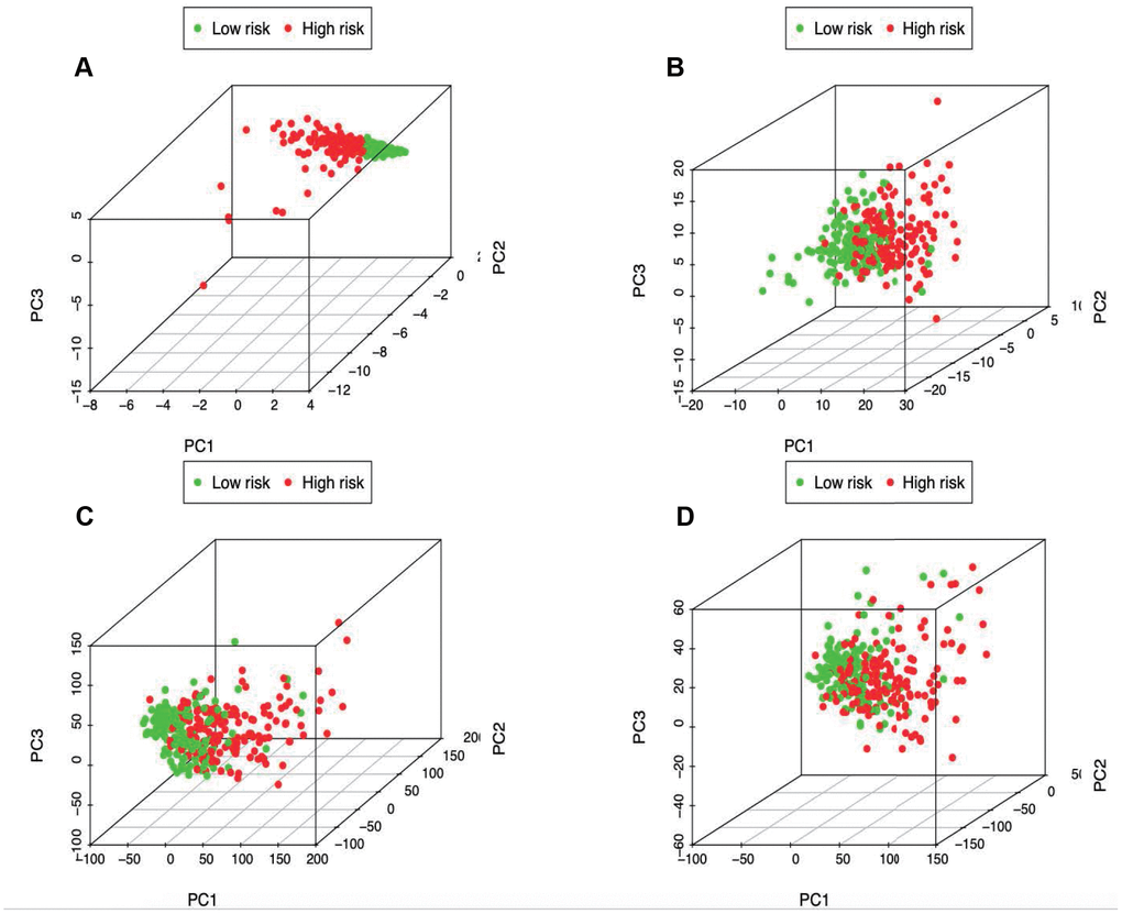 PCA was further conducted to examine the difference between low- and high-risk groups based on the immune-related signature (Figure 7A), immune genes (Figure 7B), differently expressed genes (Figure 7C) and the entire gene expression profiles (Figure 7D). The results obtained based on our model showed that low- and high-risk groups were generally distributed at different directions. Nonetheless, the distributions of high- and low-risk groups displayed in Figure 7B–7D were relatively scattered, which confirmed that our prognosis signature was capable of distinguishing the high-risk group from the low-risk group.