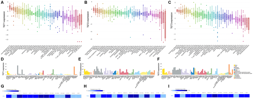 Firstly, TETs expression in human cancer cell lines is assessed by the CCLE dataset (https://www. broadinstitute.org/ccle), which provides public access to genomic data, analysis, and visualization for about 1000 cell lines [35]. Secondly, we also used The HPA dataset (https://www.proteinatlas.org/) to verify TETs expression in human cancer cell lines [36]. Lastly, TETs expression in AML cell lines is verified by the EMBL-EBI dataset (https://www.ebi.ac.uk), which has provided free and open access to a range of bioinformatics applications for sequence analysis since 1998 [37].