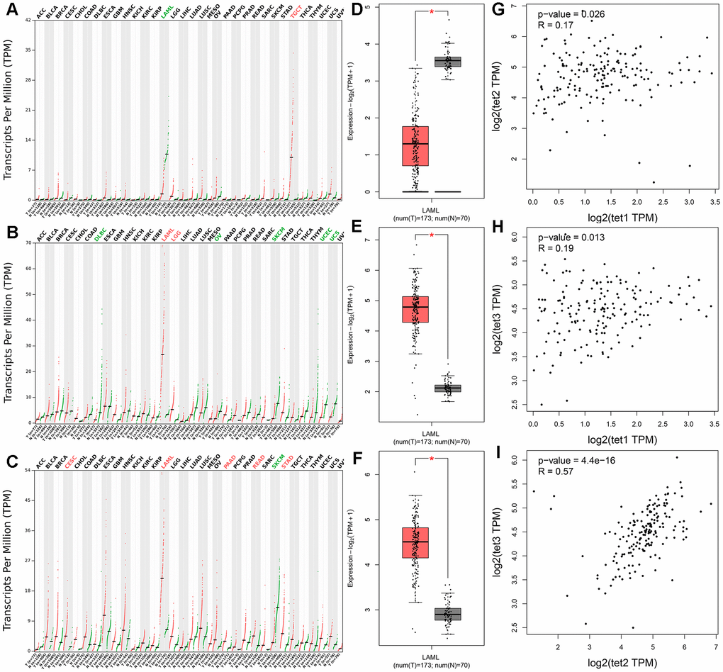 We further evaluated TETs expression in AML patients by using the Gene Expression Profiling Interactive Analysis (GEPIA) dataset including TCGA and the Genotype-Tissue Expression (GTEx) projects. Aberrant expression of all TETs members was only observed in AML patients among 33 types of human cancers (Figure 2A–2C). TET1 expression was significantly reduced in AML patients, whereas TET2 and TET3 expression was significantly increased in AML patients (Figure 2D–2F). Moreover, TET1 expression did not show a significant correlation with TET2/TET3 expression in AML patients, whereas TET2 expression was positively correlated with TET3 expression in AML patients (Figure 2G–2I). In addition, TET1 and TET3 mutations were identified in none of these AML patients, whereas TET2 mutation was identified in 8.5% (17/200) of these AML patients.