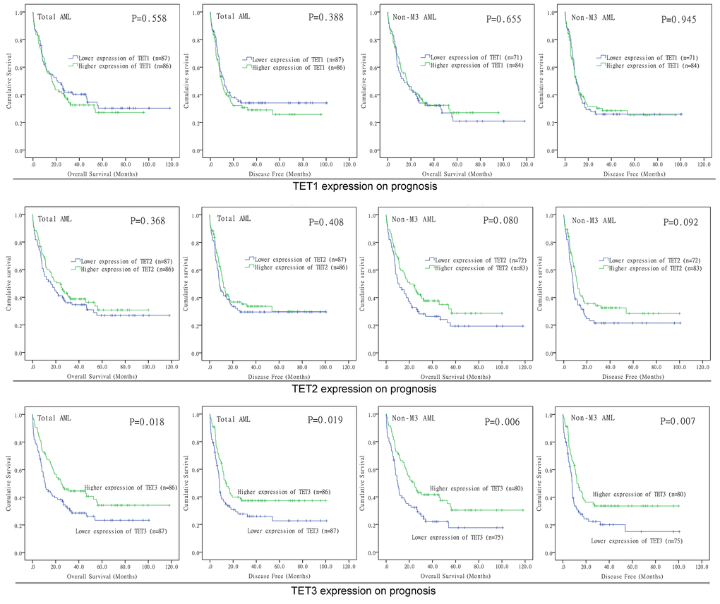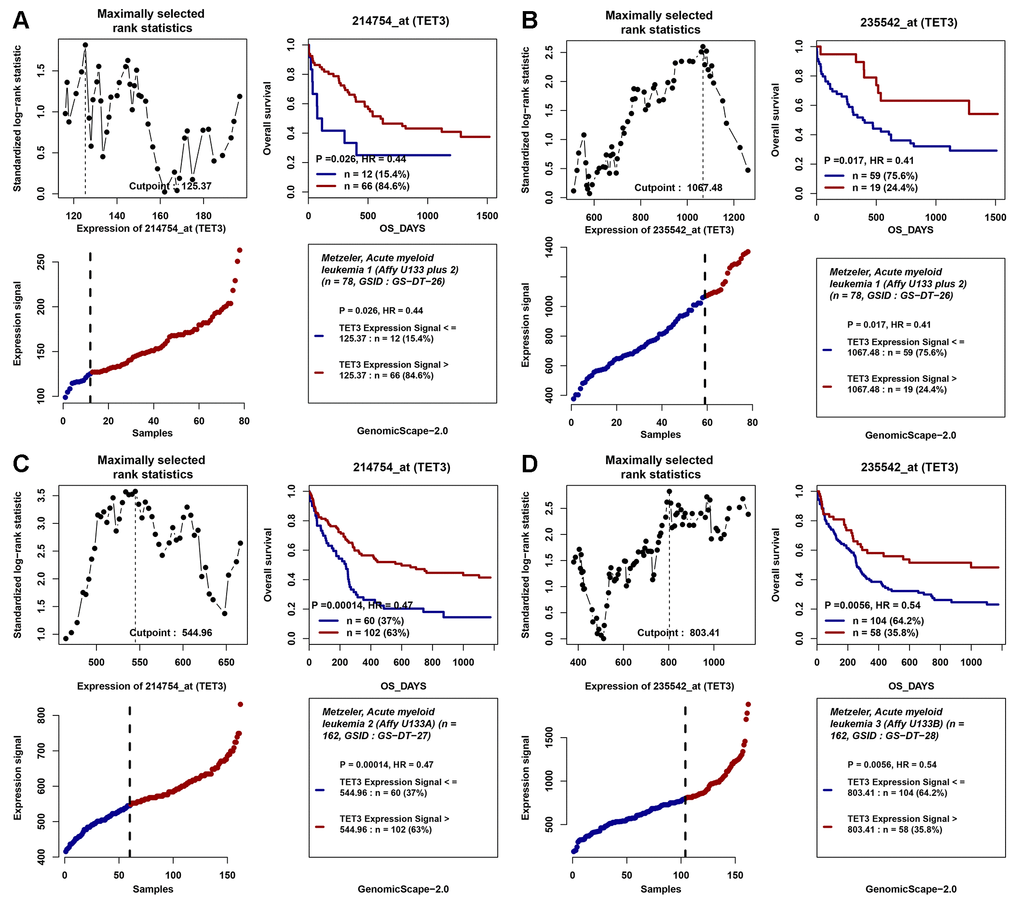 In addition, two cohorts of 162 and 78 CN-AML patients from GEO data (GSE12417) were also included. The online web tool Genomicscape (http://genomicscape.com/microarray/survival.php) was applied to validate the prognostic value of TETs expression among CN-AML patients.