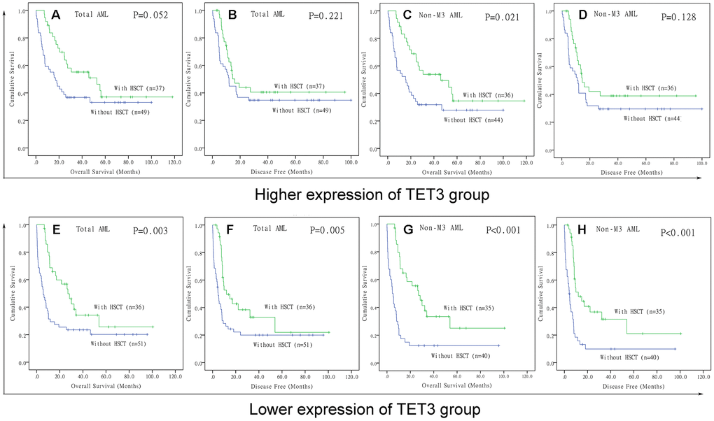 Because low expression of TET3 predicted poor clinical outcome in AML, we intended to investigate whether patients with low expression of TET3 could benefit from hematopoietic stem cell transplantation (HSCT). We compared OS and DFS between patients with and without HSCT among both TET3high and TET3low groups. In TET3high groups, although patients who received HSCT presented longer OS and DFS compared with patients who did not receive HSCT among both total AML (Figure 5A and 5B, P=0.052 and 0.221, respectively) and non-M3-AML (Figure 5C and 5D, P=0.021 and 0.128, respectively), the P did not attach statistical significance especially for DFS. However, in TET3low groups, patients who accepted HSCT showed significantly longer OS and DFS than patients who did not accept HSCT among both total AML (Figure 5E and 5F, P=0.003 and 0.005, respectively) and non-M3-AML (Figure 5G and 5H, P<0.001 and 0.001, respectively).