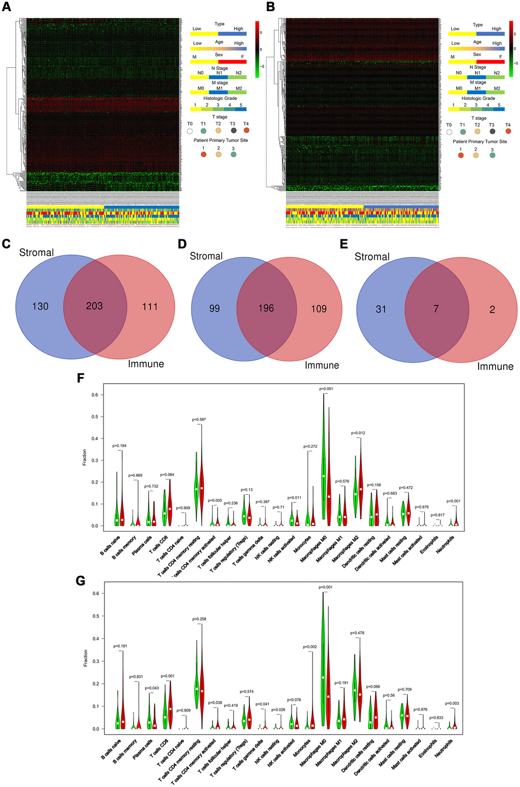We downloaded the transcriptome and clinical data of 182 PAAD program cases from the TCGA database. Based on the ESTIMATE database results and the median values of the stromal and immune scores (excluding the normal pancreas cases), we divided these patients into high and low stromal score groups and high and low immune score groups. We displayed distinct these clinicopathological features, including age, sex, N stage, M stage, histologic grade, T stage, and primary tumor sites, and mRNA expression forms between high and low stromal (Figure 1A) and between high and low immune (Figure 1B) score groups in the form of heatmaps. We found statistically significant results only for sex and M stage between high and low stromal scores (P = 0.010 and P = 0.010, respectively), whereas only for N stage between high and low immune scores (P = 0.049) as shown in Table 1. And the age, M stage, histologic grade, T stage, and primary tumor sites were not significantly different between two groups. Low stromal scores group was characterized by a higher number of male patients and poorly M stages compared with high stromal scores group. Low immune scores group included more patients with better N stages compared with high immune scores group. Based on our threshold value (log fold change ≥1.5 and P <0.05), there were 333 DEGs between high and low stromal groups and 314 DEGs between high and low immune score groups (Supplementary Tables 5 and 6). The Venn diagram (Figure 1C) used to find the co-DEGs in the two groups showed that 203 genes, which accounted for the majority of DEGs, were differentially expressed simultaneously in two score-related comparisons. Moreover, these simultaneously upregulated and downregulated differentially expressed DEGs were 196 and 7, respectively, with the same alternative trend between the two groups (Figure 1D and 1E). As shown in Figure 1F and 1G, CIBERSORT results revealed that CD4+ activated memory T cells (P = 0.005), M2 macrophages (P = 0.012), and neutrophils (P<0.001) were upregulated, while activated NK cells (P = 0.011) and M0 macrophages (P = 0.001) were downregulated in the high stromal-score group. In the high immune-score group, CD8 T cells (P = 0.001), gamma delta T cell (P = 0.041), resting NK cells (P=0.026), monocytes (P = 0.002), and neutrophils (P = 0.003) were upregulated, while plasma cells (P = 0.043) and M0 macrophages (P = 0.001) were downregulated. Hence, we used the ESTIMATE algorithm to identify DEGs associated with stroma and immune scores successfully.
