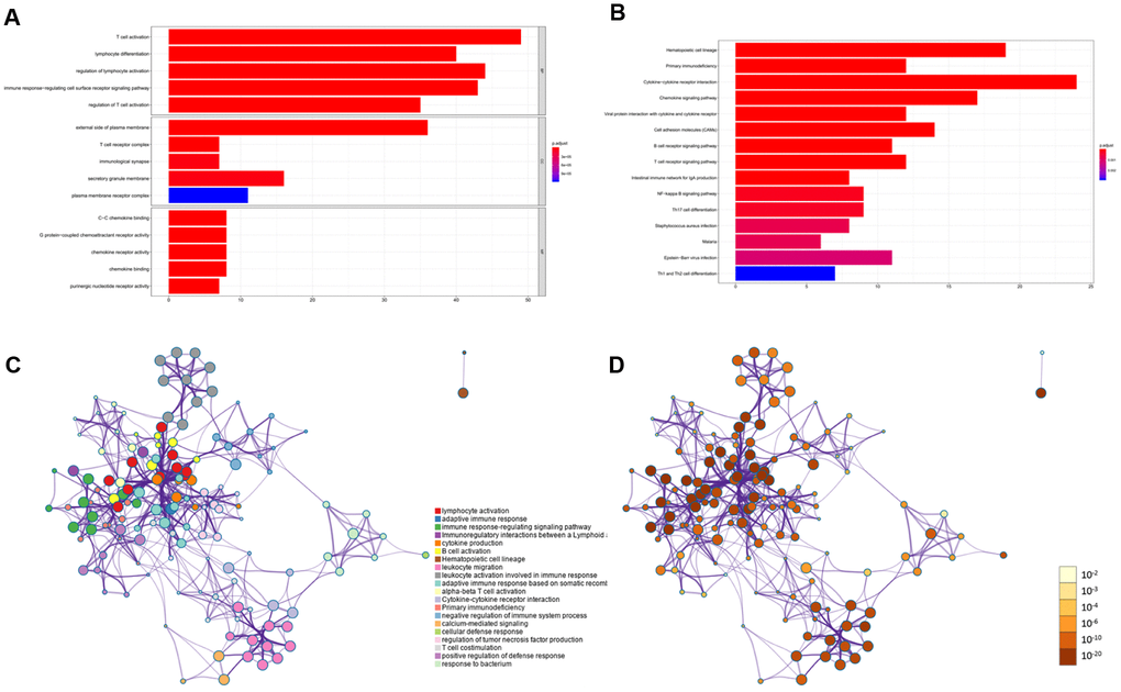 To identify differentially regulated genes on immune cell infiltration, we used Metascape tools to conduct the GO and KEGG analyses of the 203 simultaneously expressed DEGs. The Heatmap in Figure 2A exhibits the top 15 enriched GO terms across the DEGs based on Biological Process (BP), Cellular Component (CC), and Molecular Function (MF), and the heatmap in Figure 2B also exhibits the top 15 enriched KEGG pathways across the DEGs. Among them, most terms or pathways were associated with biological processes and lymphocyte activation. We also applied protein-protein interaction networks from the DEGs, which were coloured by different cluster IDs (Figure 2C) and P-values (Figure 2D), and the networks contained more genes that tended to have more significant p-values. Since most networks from the DEGs were related to biological processes and lymphocyte activation, the result confirmed in reverse that the DEGs identified based on stroma and immune scores were accurate. Consequently, combined with the result showed in Figure 1, our study identified that most of the DEGs identified based on the immune and stromal scores were correlated considerably with the immune responses or immune cell infiltration in PAAD.
