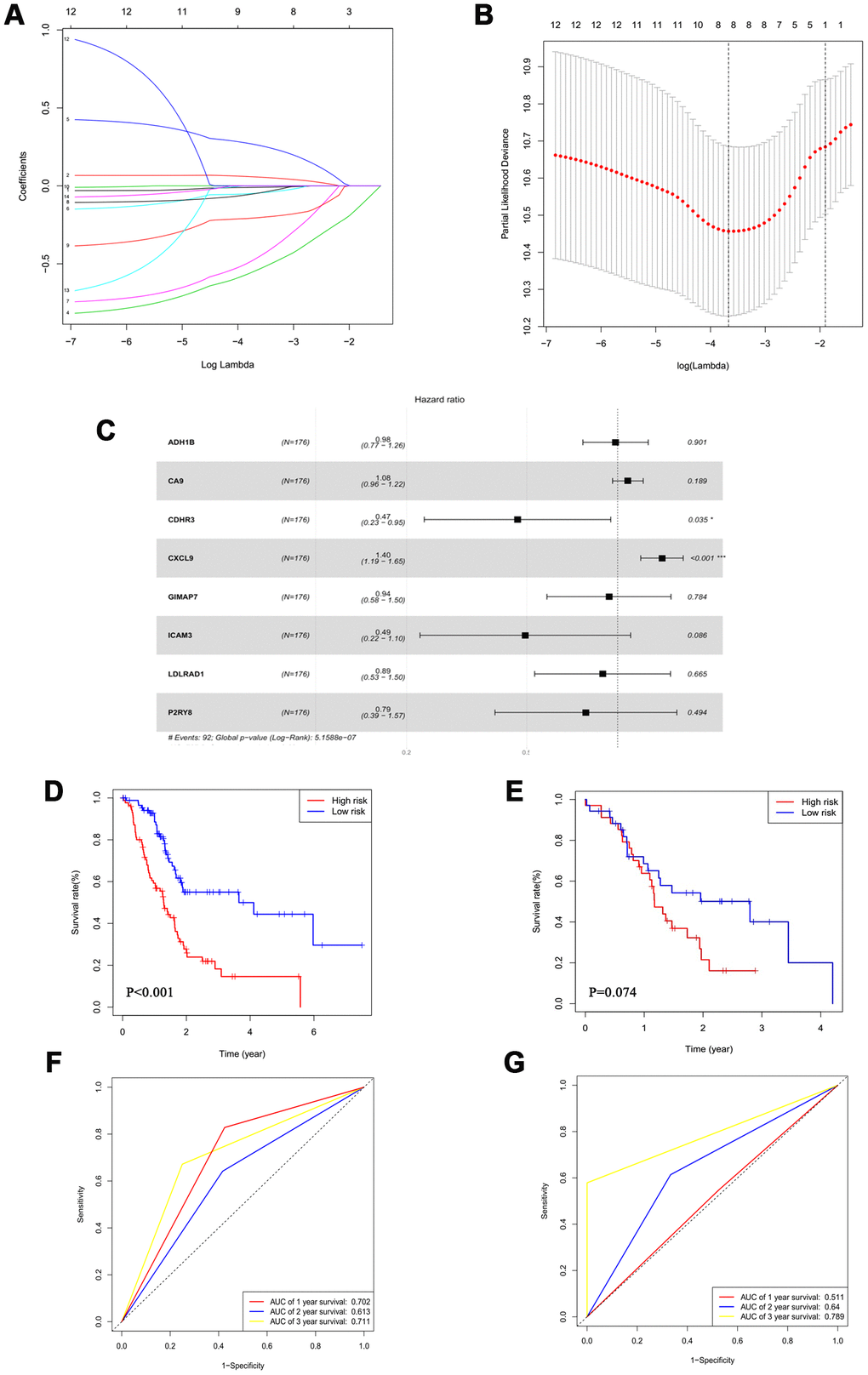 The forest plot demonstrated the association between each gene and overall survival (Figure 3C). According to these results, we identified an 8-mRNA signature to evaluate the overall survival time of PAAD patients based on the expression of the 8 mRNAs and their regression coefficients as follows: Risk score = (-0.01579 × expression level of ADH1B) + (0.07838 × expression level of CA9) + (-0.76361 × expression level of CDHR3) + (0.33812 × expression level of CXCL9) + (-0.06606 × expression level of GIMAP7) + (-0.70384 × expression level of ICAM3) + (-0.11457 × expression level of LDLRAD1) + (-0.24179 × expression level of P2RY8). Patients in the TCGA cohort were divided into a low-risk group (N=88) and a high-risk group (N=88) utilizing the median risk score as the cut-off value.
