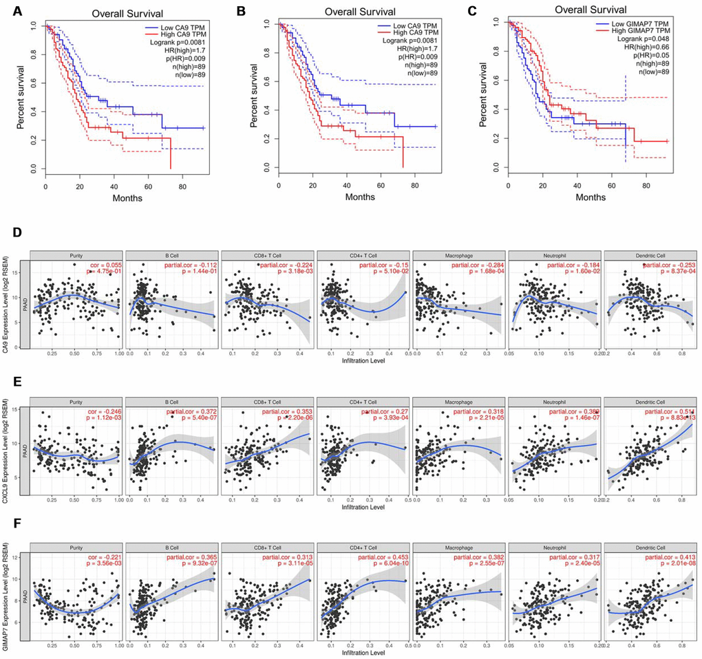 To further explore the regulatory mechanisms for the prognosis of PAAD based on the eight differentially expressed genes in our signature, we searched the GEPIA web tool [18] for an association between the expression of genes at the mRNA level and Overall Survival (OS). The result showed that carbonic anhydrase 9 (CA9), C-X-C motif chemokine ligand 9 (CXCL9), and GTPase, IMAP family member 7 (GIMAP7) were independently associated with the overall survival (OS) rate of PAAD (Figure 4A–4C) but not with the other five factors (Supplementary Figure 1A–1E). So CA9, CXCL9, and GIMAP7 were included for further exploration.