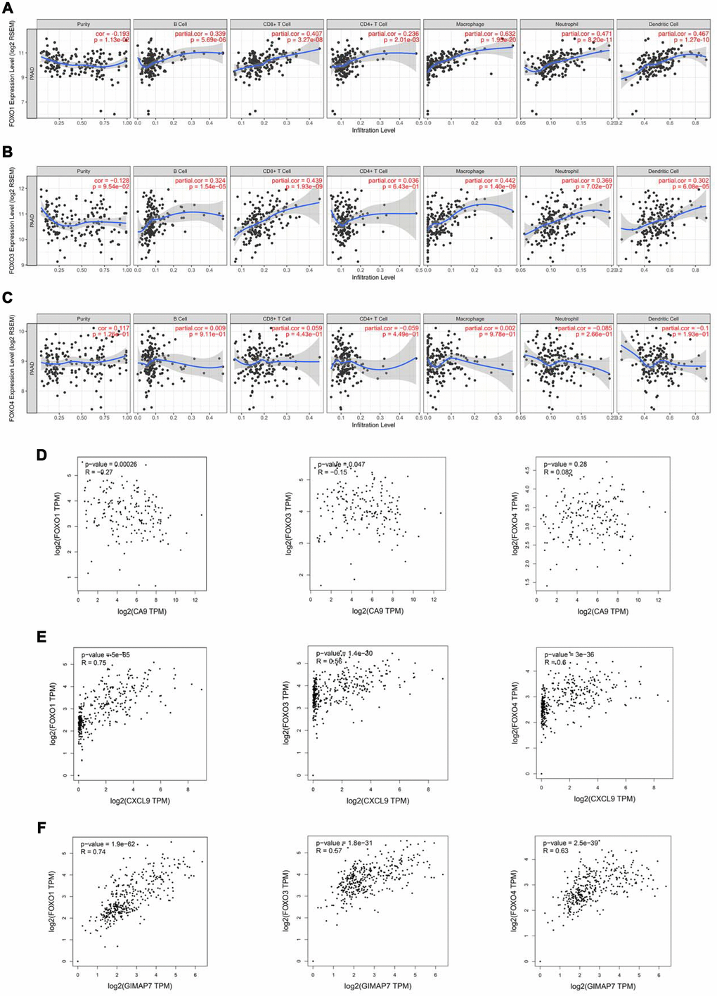 Reportedly, the Forkhead box O (FOXOs) family intrinsically influences the anti-tumour immune response and the infiltration levels of immune cells, including CD4+ T cells and CD8+ T cells, B cells, neutrophil cells, macrophage cells, and dendritic cells [19]. Consistent with this report, our data also showed a significant correlation between the expression level of FOXO1 or FOXO3, but not FOXO4, and the infiltration levels of these immune cells (Figure 5A–5C). Furthermore, by searching the GEPIA web tool, we found a negative correlation between the mRNA expression level of CA9 and the FOXOs family in PAAD patients (Figure 5D). On the contrary, the mRNA expression level of CXCL9 correlated positively with FOXOs (Figure 5E), and so did mRNA expression level of GIMAP7 with FOXOs in PAAD (Figure 5F). Consequently, we hypothesised that CA9, CXCL9, and GIMAP7 regulated the infiltration level of immune cells by modifying FOXOs in PAAD.