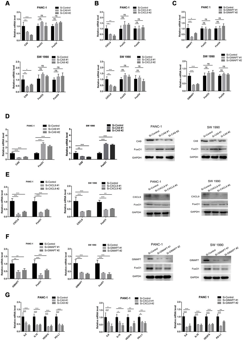 To determine whether CA9, CXCL9, and GIMAP7 regulated the immune cell infiltration via FOXOs, we first analyzed the relationship between FOXO3 and FOXO4 and these three genes. We knocked down each of CA9, CXCL9, or GIMAP7 using a gene-specific siRNA and detected the changes in the mRNA level of FOXO3 or FOXO4. We found that these three genes (CA9, CXCL9, or GIMAP7) had apparent effects on FOXO3 and FOXO4 in both PANC-1 and SW 1190 cells (Figure 6A–6C). In contrast, the examination of the correlation between FOXO1 with these three genes indicated that repressing the level of CA9 increased the protein and mRNA levels of FOXO1 in PAAD cells (Figure 6D), whereas, the inhibition of CXCL9 or GIMAP7 by siRNA down-regulated the levels of FOXO1 in PANC-1 and SW 1990 cells (Figure 6E and 6F).