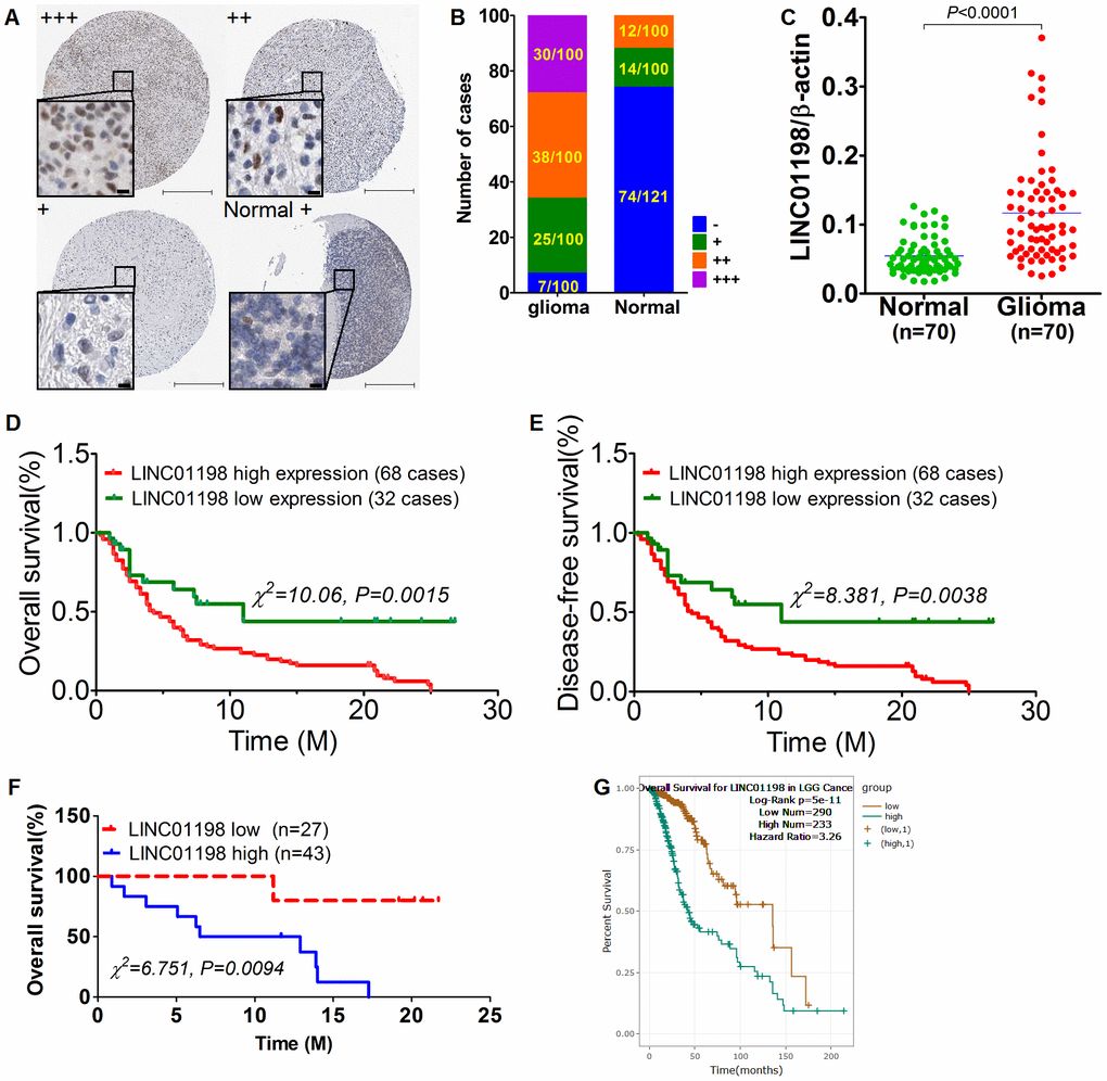 Table 1. Clinicopathological significance of LINC01198 expression in 100 cases of glioma tissues.