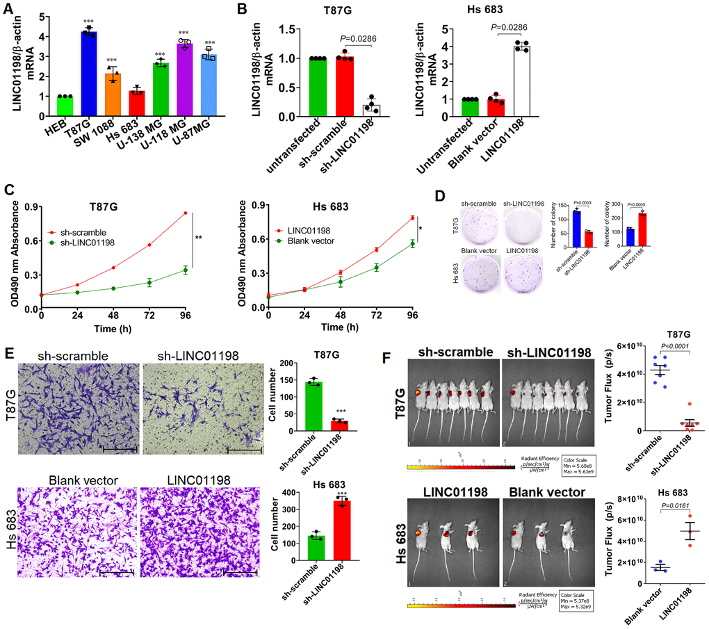 To understand the biological roles of LINC01198 involved in the proliferation and invasion of glioma cells, Lentiviral-based short hairpin RNA (shRNA) interference vector and over-expression vector were constructed. A panel of six different kinds of glioma cell lines was enrolled and wherein the basal level of LINC01198 was evaluated using qRT-PCR. QRT-PCR detection revealed that among the six different kinds of glioma cell lines, T87G whose LINC01198 level was highest of all whereas the level of LINC01198 in Hs 683 was lowest (Figure 2A). Next to qRT-PCR detection, T87G cells were transfected with Lentiviral-shRNA-LINC01198 (hereafter referred to as sh-LINC01198), while Hs 683 cells were transfected with Lentiviral-LINC01198 (hereafter referred to as LINC01198). The negative controls that correspond to each were named sh-scramble and blank vector, respectively. Firstly, the knock down and over-expression efficiency were appraised using qRT-PCR, displaying that the lentiviral vectors can effectively work (Figure 2B). Based on which, MTT assay was performed to evaluate the proliferative variation after LINC01198 was stably knocked down or up-regulated. Results of MTT showed that LINC01198 can intensify the proliferation of glioma cells (Figure 2C), which was corroborated by clonogenesis assay (Figure 2D). Incidentally, Transwell assay was conducted to assess the invasive variation of glioma cells after the changing of LINC01198 expression. Data from Transwell assay exhibited that LINC01198 can profoundly promote the invasive abilities of glioma cells tested (Figure 2E). To further confirm what we observed in vitro cell lines, subcutaneous xenograft mouse model was employed to further evaluate the effect on proliferation LINC01198 exerted in vivo. Consistently, it exhibited that subcutaneous tumor volume was remarkably larger than that in control group (Figure 2F). Together, the data we achieved here demonstrated that LINC01198 promotes proliferation of glioma cells both in vitro and in vivo.
