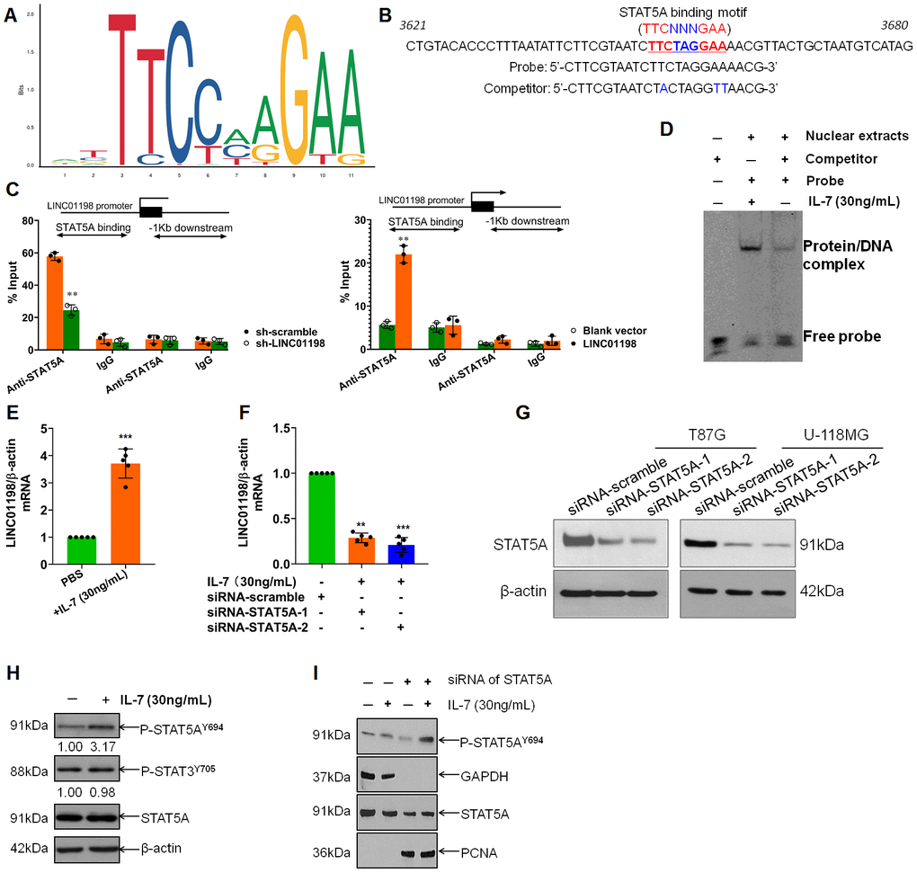 Having learned about the oncogenic traits of LINC01198, we next sought to get insight into the LINC01198. The promoter sequence of LINC01198 was subjected to bioinformatic analysis using JASPAR (http://jaspar.genereg.net/). Analysis revealed that there were STAT5A binding motifs in the promoter of LINC01198 (Figure 3A and 3B), meaning that STAT5A can be a putative TF for LINC01198. To verify the bioinformatic analysis JASPAR did, chromatin-immunoprecipitation (CHIP) was carried out to quantitatively evaluate the putative TF regulation of STAT5A on LINC01198. CHIP data showed that STAT5A can effectively operate as TF in the promoter of LINC01198, compared with negative control (Figure 3C). To further confirm, EMSA experiment was conducted exhibiting that STAT5A can acutely bind with the promoter probe of LINC01198, compared with control probe (Figure 3D). Subsequently, to further explore the regulation of STAT5A on the transcription of LINC01198, glioma cells were stimulated with recombinant human IL-7. qRT-PCR detection showed that LINC01198 was dramatically increased after stimulation with recombinant human IL-7, compared with control (Figure 3E); which can be abolished after STAT5A was silenced with specific siRNA (Figure 3F and 3G), strongly suggesting that activated STAT5A was required for up-regulation of LINC01198. In considering of STAT3, another important paralog of STAT5A; and that no specific commercial chemical inhibitor to STAT5A was available yet; to rule out the possible confounding influence that may be caused by STAT3, Immunoblot was performed to detect the variation of activated STAT3. It showed that IL-7 can specifically activate the activation of STAT5A, rather than STAT3 (Figure 3H). Next, Immunoblotting result revealed that, much like STAT3, nuclear translocation can occur to STAT5A once activated by IL-7 (Figure 3I). Overall, the data we showed here demonstrate that STAT5A was identified as transcription factor that can positively regulate the transcription of LINC01198.