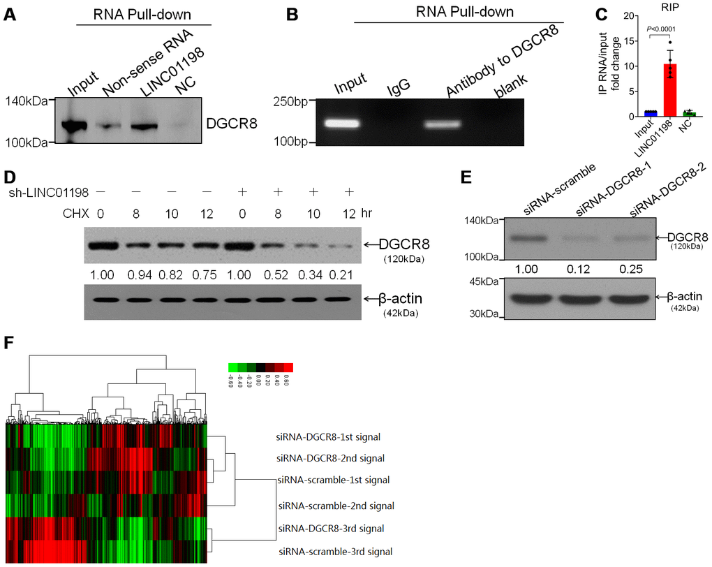 Subsequently, we set out to identify the possible proteins that are unidentified that can interact with LINC01198. RNA binding protein immunoprecipitation (RIP) assay coupled with mass spectrometry analysis were performed. It was found that, it is DGCR8 that can directly interact with LINC01198 (Figure 4A–4C) with the aid of RIP analysis. Moreover, LINC01198 was discovered to be able to stabilize the DGCR8 (Figure 4D), in addition to it can bind with DGCR8. Given the key role of DGCR8 mediated in the microprocess [13, 14] and biogenesis of miRNA [15] involved in carcinogenesis, we next wonder whether the miRNA profile could be mediated by DGCR8 in glioma. Therefore, on the basis of successful silencing of DGCR8 using siRNA technique (Figure 4E), miRNA microarray analysis was undertaken (Figure 4E). The data presented here showed that, LINC01198 not only can bind with DGCR8 but also can stabilize it, explicitly suggestive of the scaffold role implicated in biogenesis of miRNA.