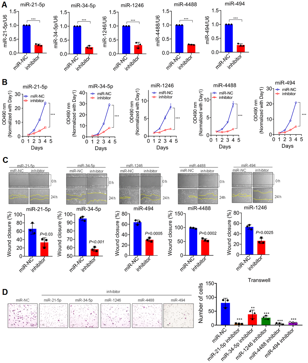 In consideration that the expression of DGCR8 was tightly controlled in organism because of it is required for normal miRNA biogenesis and physiological functions; deregulations or alterations of DGCR8 expression linking with the aberrant expressions of miRNAs have therefore been detected in many diseases such as schizophrenia [16] and different kinds of cancers [14]. Inspired by these previous studies, we next sought to investigate the differential miRNA profile involved in the alteration of DGCR8 expression in glioma cells of our own. Firstly, DGCR8 expression was knocked down using specific siRNA with success, as evidenced by western-blot analyses (Figure 4E), followed by miRNA microarray was carried out (Figure 4F). Cluster heat map revealed that there were several miRNAs that were significantly down-regulated comprising miR-21-5p, miR-34-5p, miR-1246, miR-4488 and miR-494. Among these differential miRNAs that were screened out, GO analysis was conducted. The resultant analysis showed that these miRNAs that were markedly down-regulated with DGCR8 being significantly knocked down, were heavily implicated in cell proliferation (Figure 5B). To further confirm that these differential miRNA screened out were implicated in proliferation of glioma cells, all these five miRNAs were knocked down through transient transfection with miRNA inhibitor (Figure 5A). Then, MTT assay was performed. Results of MTT assay revealed that silencing of these five miRNAs was shown to be all able to significantly suppress the proliferation of glioma cells (Figure 5B). Meanwhile, both Transwell and Wound closure assays were also carried out to observe whether silencing of these miRNAs could have effects on invasion and migration. Data we collected showed that knock-down of them can markedly suppress the invasion and migration of glioma cells. Taken together, these data we obtained suggested that DGCR8 generated miRNA profile that can enhance the proliferation of glioma cells.