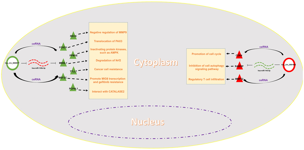 Increasing evidences have demonstrated that circRNAs serve as crucial players in initiation and progression of human cancers, including CRC. In spite of some studies have reported their constructed circRNA-miRNA-mRNA regulatory network in CRC [14, 15]. However, the current knowledge of circRNA-associated ceRNA network in CRC remain inadequate and need to be further investigated. In the present study, by a series of in silico analysis, we identified a potential circRNA-miRNA-mRNA ceRNA regulatory network in CRC pathogenesis.