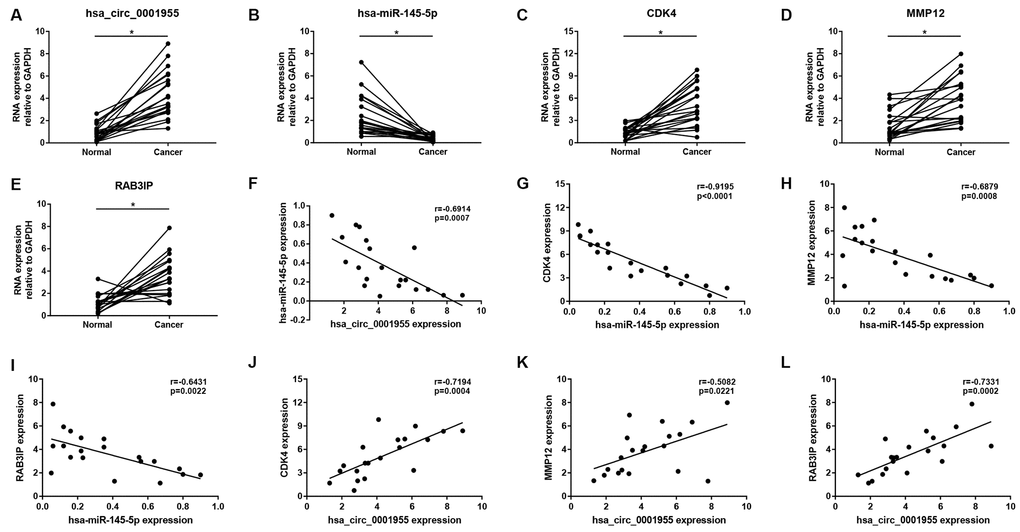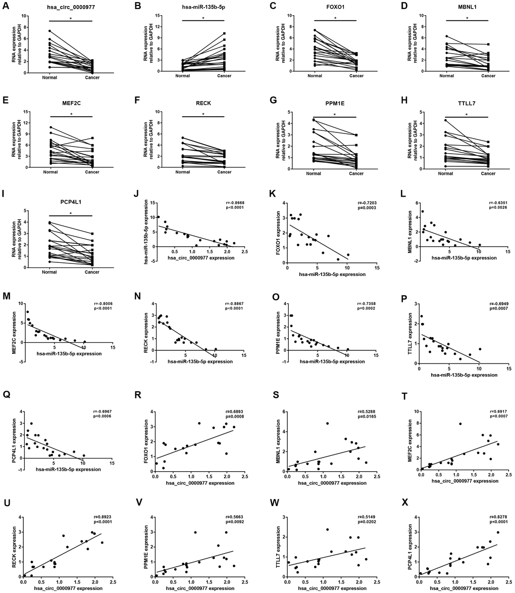 Expression correlation of between miR-145-5p or miR-135b-5p and their corresponding target genes in CRC was assessed using the data from GSE126093 and GSE126092. The miR-145-5p-target gene network, containing 17 miRNA-target gene pairs, was constructed in Figure 7A. As presented in Figure 7B–7R, miR-145-5p expression was inversely linked to all the 17 target gene expression whereas only miR-145-5p/CBFB, miR-145-5p/CDK4, miR-145-5p/MMP1, miR-145-5p/MMP12, miR-145-5p/ROBO2, miR-145-5p/SNTB1, miR-145-5p/TGFBI, miR-145-5p/LMNB2, miR-145-5p/RAB3IP and miR-145-5p/CRNDE pairs had statistically significant. The miR-135b-5p-target gene network, involving 10 miRNA-target gene pairs, was shown in Figure 8A. Next, the expression correlation of miR-135b-5p with 10 target genes was also detected (Figure 8B–8K). The results suggested that 7 of 10 pairs (miR-135b-5p/FOXO1, miR-135b-5p/MBNL1, miR-135b-5p/MEF2C, miR-135b-5p/RECK, miR-135b-5p/PPM1E, miR-135b-5p/TTLL7 and miR-135b-5p/PCP4L1) possessed statistically significant. We further determine the expression relationship between miR-145-5p or miR-135b-5p and their target genes using TCGA data and the results were listed in Tables 3, 4, respectively. By intersection of analytic findings from GEO and TCGA database, we found that three genes (CDK6, MMP12 and RAB3IP) and seven genes (FOXO1, MBNL1, MEF2C, RECK, PPM1E, TTLL7 and PCP4L1) were the potential downstream targets of miR-145-5p and miR-135b-5p in CRC, respectively. According to ceRNA mechanism, circRNA expression should be positively associated with target gene expression. Therefore, we finally evaluated the expression correlation of hsa_circ_0001955 with CDK6/MMP12/RAB3IP or hsa_circ_0000977 with FOXO1/MBNL1/MEF2C/RECK/PPM1E/TTLL7/PCP4L1 in CRC (Figure 9A–9J). Intriguingly, all the 10 genes were significantly positively correlated with their corresponding circRNAs. Taken all these findings together, a potential circRNA-miRNA-mRNA regulatory sub-network in CRC was successively established, containing two pathways hsa_circ_0001955-miR-145-5p-CDK4/MMP12/RAB3IP and hsa_circ_0000977-miR-135b-5p-FOXO1/MBNL1/MEF2C/RECK/PPM1E/TTLL7/PCP4 L1 (Figure 10). To further affirm the analytic results, we collected 20 CRC cancer samples and adjacent normal samples from the First Affiliated Hospital of Zhejiang University. The expression levels of all RNAs in the constructed network in CRC were determined by qRT-PCR and expression relationships among them were also assessed. As presented in Figure 11A–11E and Figure 12A–12I, hsa_circ_0001955, hsa-miR-135b-5p, CDK4, MMP12 and RAB3IP were significantly upregulated whereas hsa_circ_0000977, hsa-miR-145-5p, FOXO1, MBNL1, MEF2C, RECK, PPM1E, TTLL7 and PCP4L1 were markedly downregulated in CRC when compared with normal controls, which were in accordance with GEO and TCGA data. Moreover, Figure 11F–11L and Figure 12J–12X showed a similar pattern of results compared to previous in silico analytic results, partially supporting the accuracy of in silico analysis in this study.