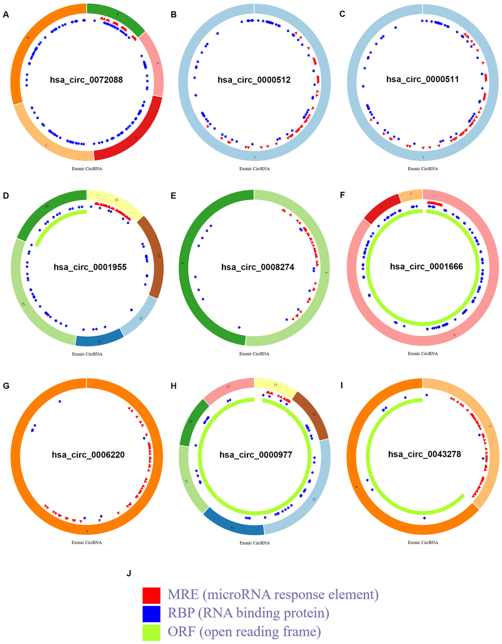 To find the potential circRNAs in CRC, circRNA dataset of 10 CRC patients (GSE126094) from GEO database was selected. GEO2R tool provided by GEO database was used to perform differential expression analysis for GSE126094. As listed in Figure 1A and Supplementary Table 1, a total of 1850 significant DECs, containing 1831 upregulated DECs and 19 downregulated DECs, were screened out. Next, we further selected some more potential DECs from the 1850 significant DECs based on the selection criterion of |log2FC| > 4, and 10 circRNAs, including 6 upregulated and 4 downregulated circRNAs, were finally identified (Figure 1B and Table 1). The circBase names and parental genes of the 10 circRNAs were presented in Table 2. Subsequently, the structure of 9 circRNAs, hsa_circ_0072088 (Figure 2A), hsa_circ_0000512 (Figure 2B), hsa_circ_0000511 (Figure 2C), hsa_circ_0001955 (Figure 2D), hsa_circ_0008274 (Figure 2E), hsa_circ_0001666 (Figure 2F), hsa_circ_0006220 (Figure 2G), hsa_circ_0000977 (Figure 2H) and hsa_circ_0043278 (Figure 2I) (hsa_circ_0000981 not available) was described in Figure 2 using the data from CSCD, indicating that all the 9 circRNAs had microRNA response elements (MREs). Taken together, the 9 circRNAs may be the key circRNAs in CRC by acting as miRNA sponges.