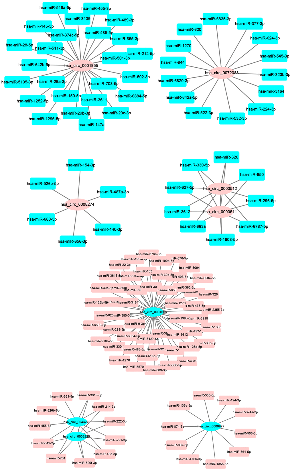 Most of statistical analyses have been calculated by the online databases or tools. Expression correlation for RNA-RNA interactions was perform by Person correlation coefficient using Graphpad Prism software (version 7). Paired Student’s t-test was used to evaluate expression differences of circRNA, miRNA or gene between normal group and cancer group. Results with P-value < 0.05 were considered as statistically significant.