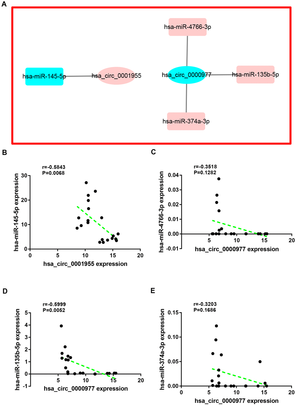 Next, miRNAs that might bind to the 9 circRNAs were predicted through starBase database. As listed in Supplementary Table 2, 14, 9, 9, 25, 6, 52, 8, 10 and 11 miRNAs were found to potentially bind to hsa_circ_0072088, hsa_circ_0000512, hsa_circ_0000511, hsa_circ_0001955, hsa_circ_0008274, hsa_circ_0001666, hsa_circ_0006220, hsa_circ_0000977 and hsa_circ_0043278, respectively. For better visualization, the circRNA-miRNA connecting network was established by Cytoscape software as presented in Figure 3. According to ceRNA hypothesis, circRNA expression should be theoretically inversely linked to miRNA expression. Thus, we firstly screened out DEmiRNAs between CRC tissues and adjacent normal tissues using miRNA dataset GSE126093 from 10 CRC patients. Identically, GEO2R tool was employed to perform differential expression analysis for GSE126093, and 178 significant DEmiRNAs, containing 148 upregulated DEmiRNAs and 30 downregulated DEmiRNAs, were identified. The 178 significant DEmiRNAs were listed in Supplementary Table 3 and vividly presented in Figure 4A. Subsequently, by intersection of predicted targeting miRNAs of circRNAs and significant DEmiRNAs, we discovered that miR-145-5p were commonly appeared in target miRNAs of upregulated DECs set and downregulated DEmiRNAs set (Figure 4B), and 7 miRNAs (miR-3127-5p, miR-761, miR-4766-3p, miR-135a-5p, miR-135b-5p, miR-374a-3p and miR-330-3p) were collectively appeared in target miRNAs of downregulated DECs set and upregulated DEmiRNAs set (Figure 4C). Followingly, expression levels of the 8 miRNAs were also validated using TCGA data as shown in Figure 4D–4K. The results demonstrated that only miR-145-5p (Figure 4D), miR-4766-3p (Figure 4G), miR-135b-5p (Figure 4I) and miR-374a-3p (Figure 4J) expression were in accordance with the previous analytic findings. Thus, miR-145-5p, miR-4766-3p, miR-135b-5p and miR-374a-3p may be the most potential downstream miRNAs of the key circRNAs in CRC. By search of the predicted circRNA-miRNA binding pairs in Figure 3 or Supplementary Table 2, miR-145-5p potentially bound to upregulated hsa_circ_0001955, and miR-4766-3p, miR-135b-5p and miR-374a-3p were three binding miRNAs of one common downregulated circRNA, hsa_circ_0000977 (Figure 5A). The expression correlation of the four circRNA-miRNA pairs was also determined using data from GSE126094 and GSE126093 (Figure 5B–5E). All the 4 miRNAs were negatively correlated with their corresponding paired circRNA, which fitted the ceRNA hypothesis. However, among the four pairs, only hsa_circ_0001955/miR-145-5p and hsa_circ_0000977/miR-135b-5p possessed statistically significant. Altogether, hsa_circ_0001955/miR-145-5p and hsa_circ_0000977/miR-135b-5p might be two important axes in carcinogenesis of CRC.