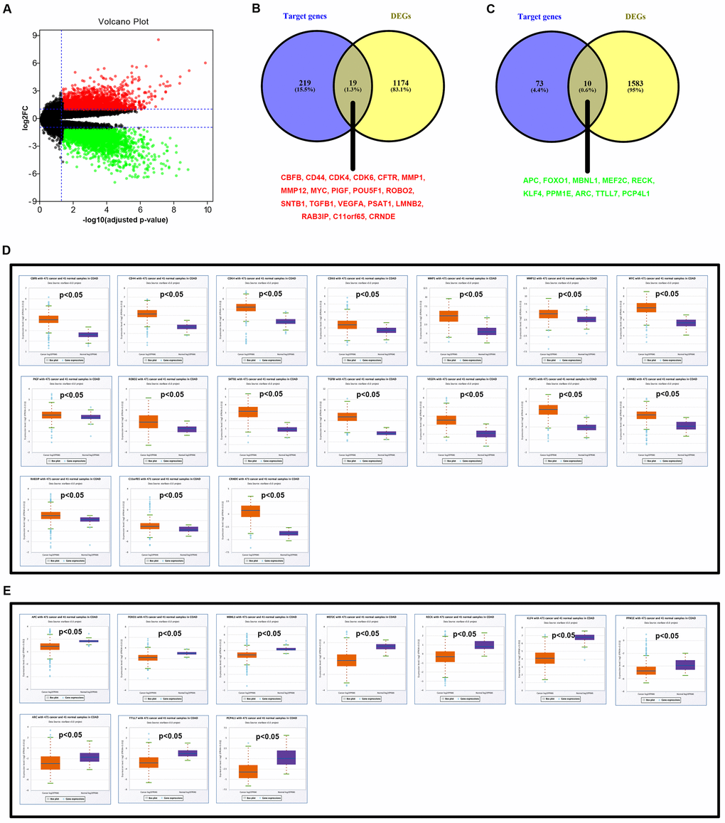 It has been widely acknowledged that miRNAs exert their biological functions by negatively regulated expression of downstream target genes. Therefore, the next step was to ascertain the downstream target genes of hsa_circ_0001955/miR-145-5p and hsa_circ_0000977/miR-135b-5p axes. Target genes of miR-145-5p and miR-135b-5p were predicted through miRNet database, and 238 and 83 target genes were forecasted to potentially bind to miR-145-5p and miR-135b-5p, respectively (Supplementary Table 4). DEGs between CRC and normal controls were obtained by GEO2R analysis using GSE126092 from the same 10 CRC patients with GSE126093 and GSE126094. As presented in Figure 6A and Supplementary Table 5, a total of 2787 DEGs, including 1194 upregulated DEGs and 1593 downregulated DEGs, were finally found. According to action mechanism of miRNA, miRNA expression should be negatively associated with expression of target gene. Thus, we performed intersection analysis for target genes set and DEGs set. As shown in Figure 6B, 19 genes (CBFB, CD44, CDK4, CDK6, CFTR, MMP1, MMP12, MYC, PIGF, POU5F1, ROBO2, SNTB1, TGFBI, VEGFA, PSAT1, LMNB2, RAB3IP, C11orf65 and CRNDE) were commonly appeared in miR-145-5p’s target genes set and upregulated DEGs set. And 10 genes (APC, FOXO1, MBNL1, MEF2C, RECK, KLF4, PPM1E, ARC, TTLL7 and PCP4L1) were commonly appeared in miR-135b-5p’s target genes set and downregulated DEGs set (Figure 6C). Next, expression levels of the 19 upregulated genes and 10 downregulated genes were further validated using TCGA data by starBase database. The results demonstrated that 17 of 19 upregulated genes (except CFTR and POU5F1) and 10 of 10 downregulated genes fitted the previous analytic findings as shown in Figure 6D and 6E, respectively. The 27 genes were considered as the downstream target genes of miR-145-5p and miR-135b-5p in CRC and selected for subsequent analysis.