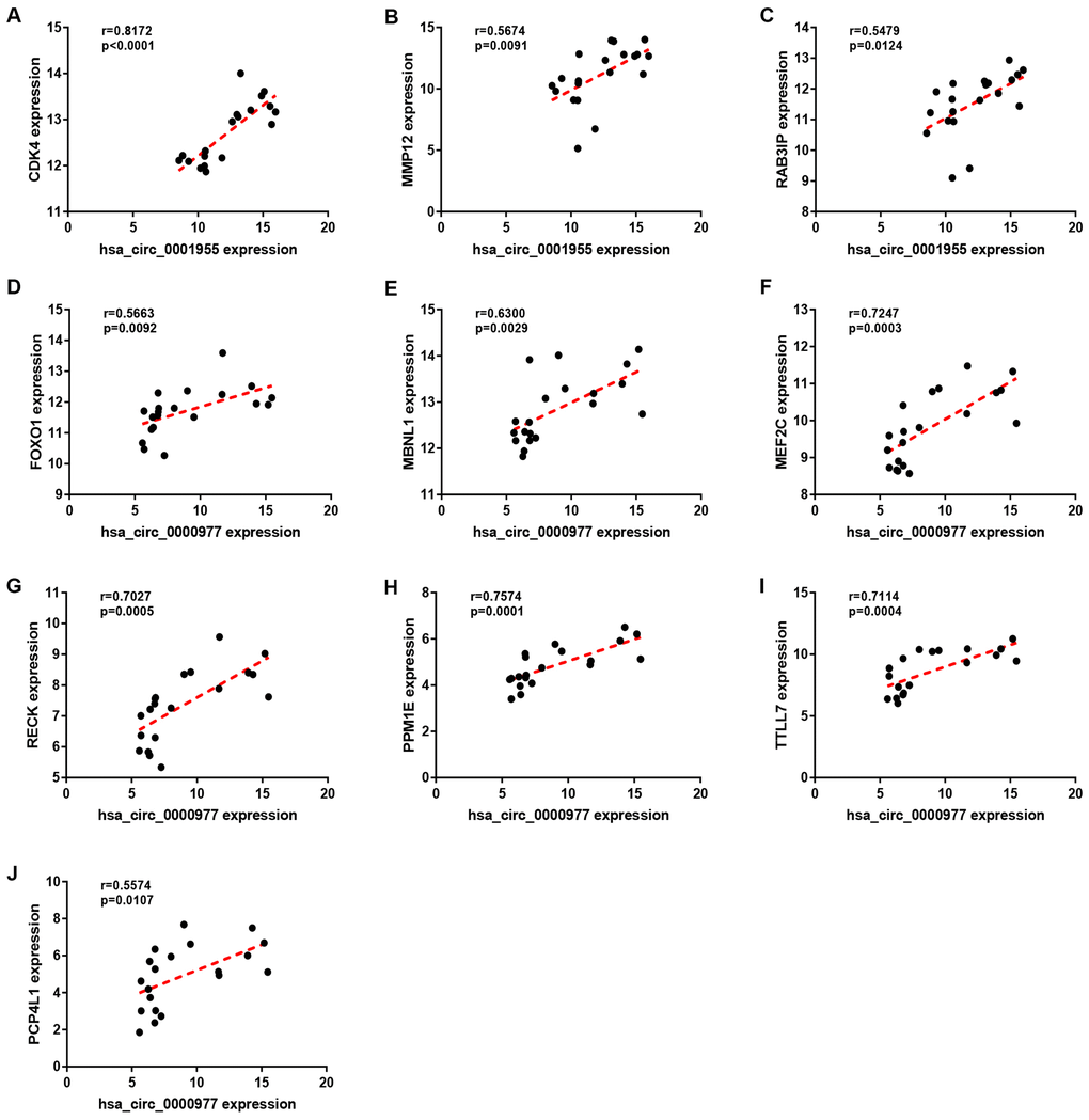According to ceRNA mechanism, there should be positive expression relationship between circRNA and target gene. Intriguingly, hsa_circ_0001955 expression was positively correlated with expression of CDK4, MMP12 and RAB3IP, and hsa_circ_0000977 was also positively associated with expression of FOXO1, MBNL1, MEF2C, RECK, PPM1E, TTLL7 and PCP4L1 in CRC.
