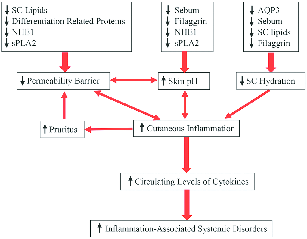 Reductions in stratum corneum hydration have been implicated in the pathogenesis of senile xerosis and aging-associated pruritus [83, 84]. Previous studies have demonstrated that reductions in SC hydration increase inflammatory infiltration, mast cell density, mast cell degranulation, and histamine content in mouse dermis [85, 86]. Increased cytokines and histamine in the skin can provoke scratching due to pruritus, resulting in disruption of epidermal permeability barrier, consequently leading to a further increase in cutaneous inflammation. Because the epidermal permeability barrier homeostasis in aged skin is compromised [7, 14], it cannot be rapidly normalized, leading to a sustained increase in cutaneous inflammation and exacerbation of preexisting inflammatory conditions, such as atopic dermatitis and eczema. Moreover, the sustained increase in cutaneous inflammation could eventually cause systemic inflammation, possibly leading to the development of inflammaging-associated disorders [5, 87]. Additionally, nocturnal pruritus can cause insomnia, resulting in exacerbation of other disorders, such as cardiovascular and Parkinson diseases [88, 89]. Thus, reduced stratum corneum hydration can lead to the development of both cutaneous and extracutaneous disorders.