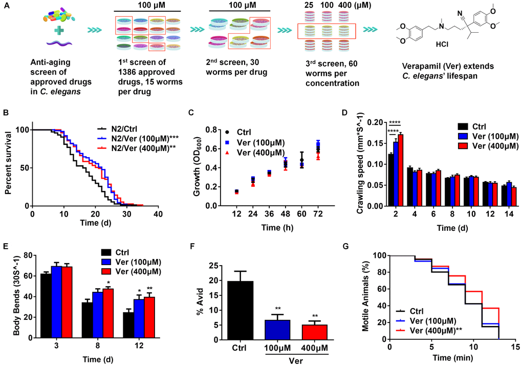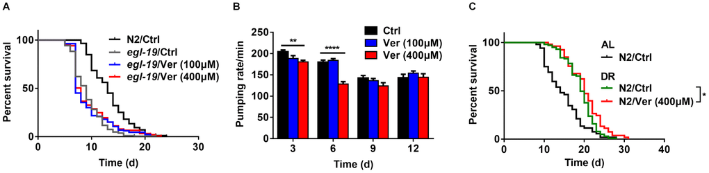 Lifespan analyses were conducted using the live Escherichia coli strain OP50 as food source. Worms were synchronized with bleaching buffer and maintained on NGM. Verapamil (Adamas, CAS: 152-11-4, 100 μM or 400 μM) was added to NGM. Plates were seeded with OP50. Worms were transferred at L4 stage to either control or verapamil (100 μM and 400 μM) treatment groups, with approximately 15-20 worms per 35-mm plate on day 0. In addition, 50 μg/mL of 5-Fluorodeoxyuridine (FudR) was added to the agar plates from day 0 to day 10 to avoid progeny hatching. Worms were counted every day and transferred to fresh plates every 3 days until all worms were dead. Worms that had either crawled off the plate or exhibited exploded vulva phenotype were censored. On day 10, all groups were transferred to control plates. Worms were treated with verapamil only for 10 days. Three replicate experiments were conducted. The survival curves were generated using GraphPad Prism 6. The log-rank (Mantel-Cox) test was used to assess curve significance.