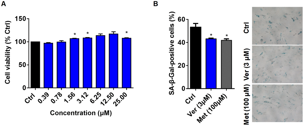 SA-β-Gal staining assay was conducted using a Senescence β-Galactosidase Staining Kit (Beyotime), according to the manufacturer’s instructions. Cells were treated with verapamil (3 μM,) for 3 days, while metformin used a positive control. Then, cells were washed using PBS and fixed in 4% formaldehyde and 0.2% glutaraldehyde for 15 min at room temperature. Then, the fixed cells were stained using fresh staining solution and incubated at 37 °C overnight to assess SA-β-Gal activity. Before imaging under Nikon Eclipse Ts2R inverted microscope at 100× magnification, the cells were stained with DAPI (Sigma). SA-β-Gal-positive cells were quantified. Unpaired t-test was used to evaluate the P-values.