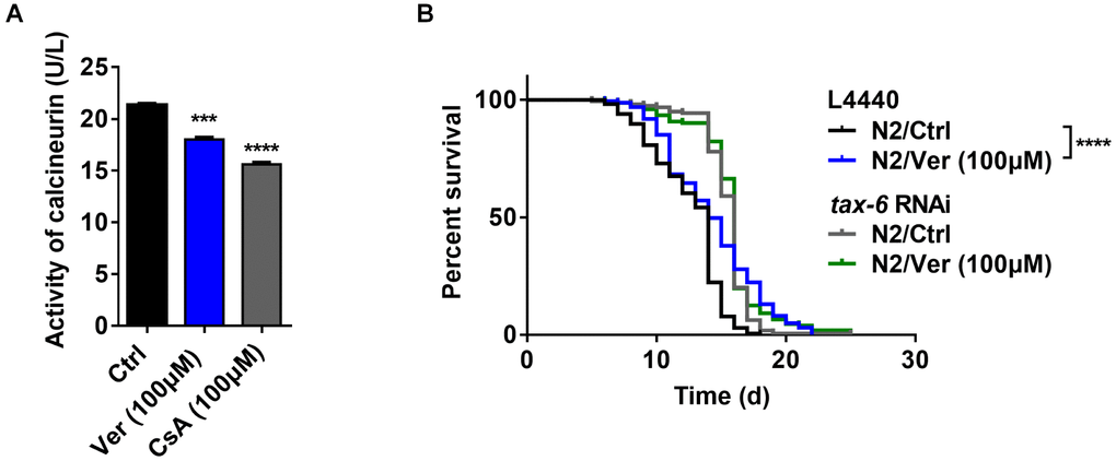 In C. elegans, calcineurin is composed of a regulatory subunit (calcineurin B, encoded by cnb-1) and a catalytic subunit (calcineurin A, encoded by cna-1/tax-6) [44, 45]. First, we identified, via ELISA, whether blocking calcium channels with verapamil inhibited calcineurin activity. We found that verapamil significantly inhibited calcineurin activity in C. elegans (Figure 4A). Then, we investigated the effects of verapamil over worm lifespan using worms (N2) fed with bacteria engineered to produce tax-6 RNAi effects. The efficacy of RNAi in decreasing tax-6 mRNA levels was assessed using qPCR (Supplementary Figure 2). Compared to worms fed with bacteria expressing the control vector (L4440), the worms with tax-6 RNAi significantly extended the lifespan of worms (Figure 4B, Table 1), which was consistent with the findings of a previous study [46]. When tax-6 expression was knocked down, verapamil no longer extended the lifespan of worms (Figure 4B, Table 1). In summary, verapamil inhibits the activity of calcineurin and extends the lifespan via a calcineurin-dependent mechanism.