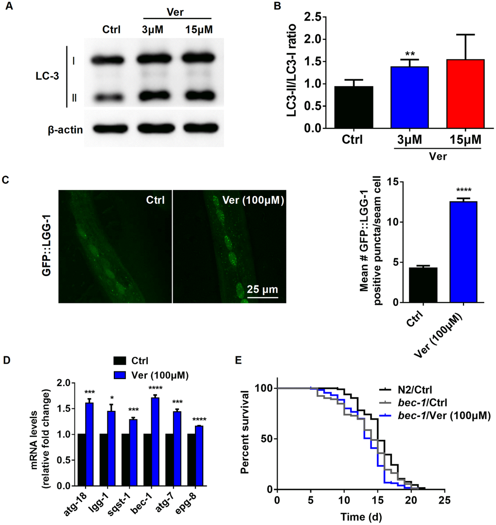 Then, to confirm whether autophagy induction is relevant to verapamil-mediated extension of C. elegans lifespan, we assessed the lifespan of bec-1(ok700) mutant, in which autophagy mediator BECLIN was downregulated. We found that verapamil no longer extended bec-1(ok700) mutant lifespan (Figure 5E, Table 1). Altogether, these results suggested that verapamil extended worm lifespan by activating autophagy.