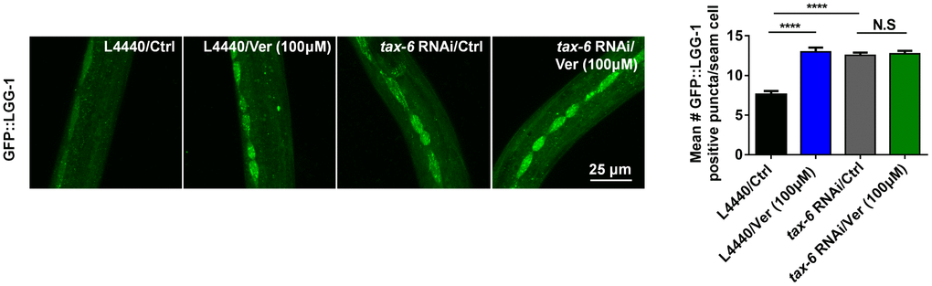 The degree of C. elegans autophagy was monitored using a GFP::LGG-1 translational reporter as described previously [59]. At L3 stage, the GFP-positive puncta in the seam cells of the worms was quantified using a Leica confocal microscope (Leica TCR 6500) at 630× magnification. Synchronized eggs were moved to control and verapamil (100 μM) treatment plates seeded with OP50 cells, bacteria expressing L4440, or bacteria engineered to produce tax-6 RNAi effects. Then, GFP::LGG-1-positive puncta were counted at the L3 stage. At least 3-10 seam cells from each worm were examined under at least two independent trials and the results were averaged. The average value was used to calculate the mean population of GFP::LGG-1-containing puncta per seam cell. An unpaired t-test was used to assess the P-values.