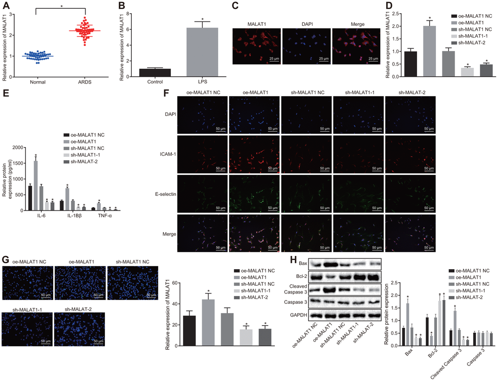 The expression of MALAT1 was initially determined in peripheral blood samples of 46 healthy controls and 46 patients with ARDS by reverse transcription quantitative polymerase chain reaction (RT-qPCR). Compared with healthy controls, the expression of MALAT1 was increased in patients with ARDS caused by different etiologies (p < 0.05) (Figure 1A). Thereafter, HPMECs were treated with lipopolysaccharide (LPS) to induce inflammation. RT-qPCR revealed that the expression of MALAT1 was increased in HPMECs upon treatment with LPS (p < 0.05) (Figure 1B). Fluorescence in situ hybridization (FISH) revealed that MALAT1 was mainly localized in the cytoplasm with minimal expression in the nucleus (Figure 1C). In addition, the expression of MALAT1 was found to be increased in LPS-treated HPMECs transfected with overexpression (oe)-MALAT1, and conversely, it was decreased upon MALAT1 silencing (short hairpin RNA [sh]-MALAT1-1 or sh-MALAT1-2) (p < 0.05) (Figure 1D).