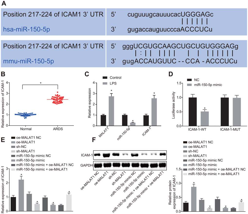 Binding sites between miR-150-5p and ICAM-1 were predicted using the starBase website (Figure 3A). LPS-treated HPMECs exhibited high expression of MALAT1 and low expression of miR-150-5p. Moreover, ICAM-1 was highly expressed in patients with ARDS and LPS-treated HPMECs (Figure 3B, 3C). The dual luciferase reporter assay exhibited that the luciferase activity of ICAM-1-WT was notably decreased following transfection of miR-150-5p mimic (p < 0.05), while that of ICAM-1-MUT showed no changes (p > 0.05) (Figure 3D), suggesting a targeting relationship between miR-150-5p and ICAM-1. RT-qPCR and Western blot analysis showed that oe-MALAT1-transfected cells showed elevated expression of ICAM-1 in comparison to oe-MALAT1 NC-transfected cells (p < 0.05). In contrast, transfection with miR-150-5p mimic led to a decrease in ICAM-1 expression compared to transfection with miR-150-5p mimic NC (p < 0.05), which was rescued by co-transfection with miR-150-5p mimic and oe-MALAT1 (p < 0.05). These findings demonstrated that MALAT1 partially alleviated the inhibitory effect of miR-150-5p on ICAM-1 expression.