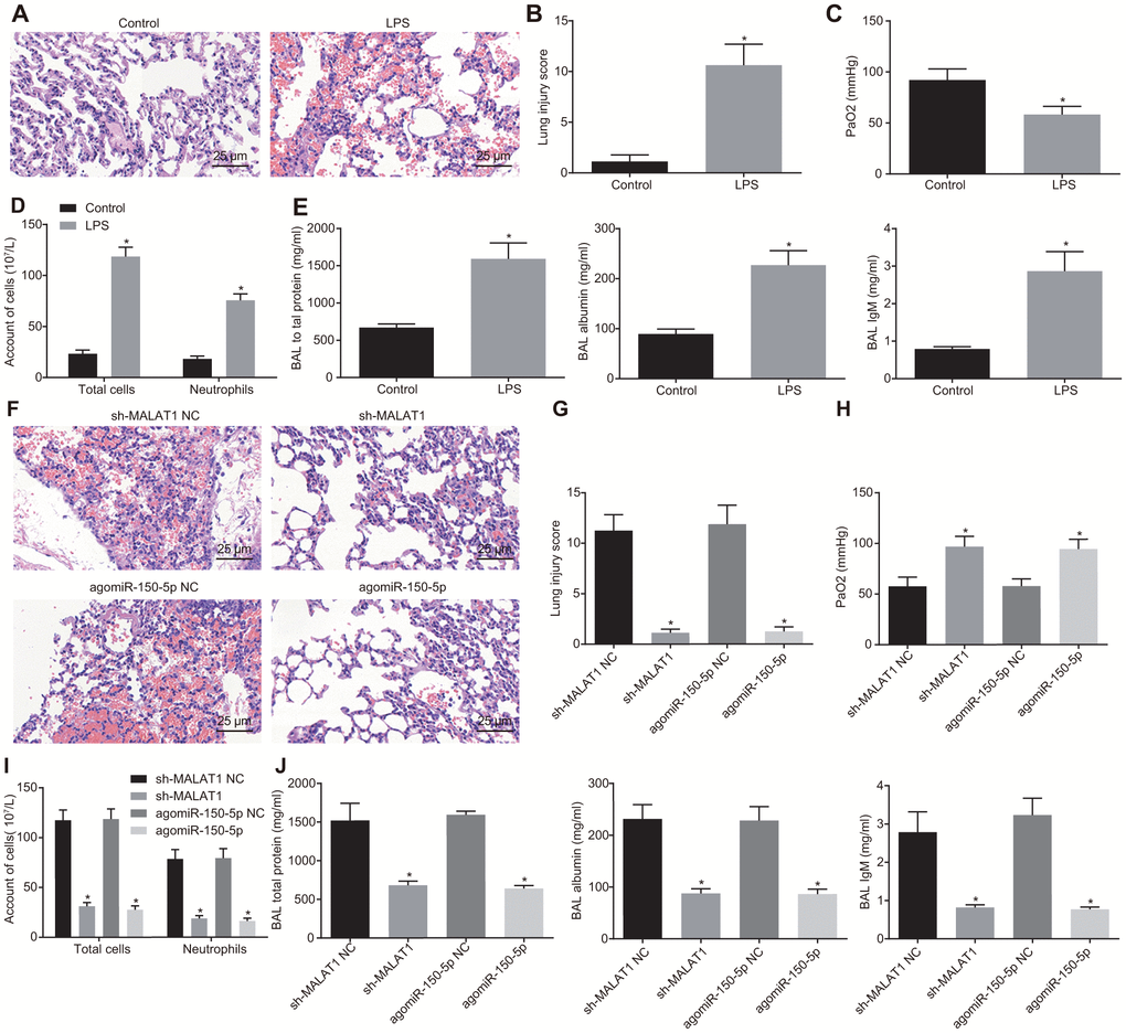 Finally, we aimed to explore the role of MALAT1 and miR-150-5p in ARDS in vivo. Hematoxylin-eosin (HE) staining analysis showed that mouse lung tissues underwent a series of typical pathological changes after treatment with LPS (Figure 5A, 5B). Next, the partial pressure of oxygen (PaO2) (Figure 5C–5E) in arterial blood, bronchoalveolar lavage (BAL) cell count, and neutrophil cell count, as well as the concentration of total protein, albumin and immunoglobulin M (IgM) in mice (Figure 5D–5G) were measured. In addition, LPS-treated mice presented with increases in pathological score, total inflammatory cells and neutrophils in BAL, and concentration of total protein, albumin, and IgM in BAL while PaO2 was decreased (p < 0.05). These findings indicated that LPS induced pneumonia and lung injury in mice.