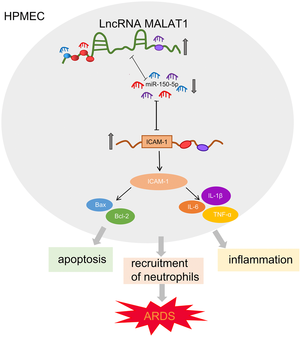 To conclude, the present study demonstrated that MALAT1 silencing could suppress HPMEC apoptosis and alleviate lung injury in ARDS via the miR-150-5p-mediated ICAM-1 axis (Figure 6), indicating that targeting MALAT1 may serve as a promising therapeutic strategy for ARDS. Our work thus identifies the evolutionarily MALAT1/miR-150-5p/ICAM-1 signaling as a major molecular pathway in the control of ARDS. Further investigations into the interaction between MALAT1, miR-150-5p, and ICAM-1 are still required to fully elucidate the specific mechanisms of MALAT1 in ARDS.