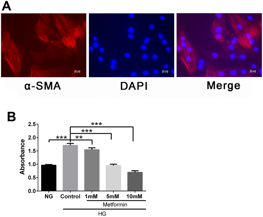 To evaluate the effects of metformin on VSMCs in a high-glucose condition, we first isolated and characterized the VSMC and confirmed the presence of the VSMC marker α-SMA in these cells (Figure 1A). We then subjected the cells to a high-glucose environment and examined the cell proliferation. Finally, metformin was added, and the results showed that metformin at concentrations of 1, 5, and 10 mM significantly inhibited high glucose–induced VSMC hyperproliferation (Figure 1B).